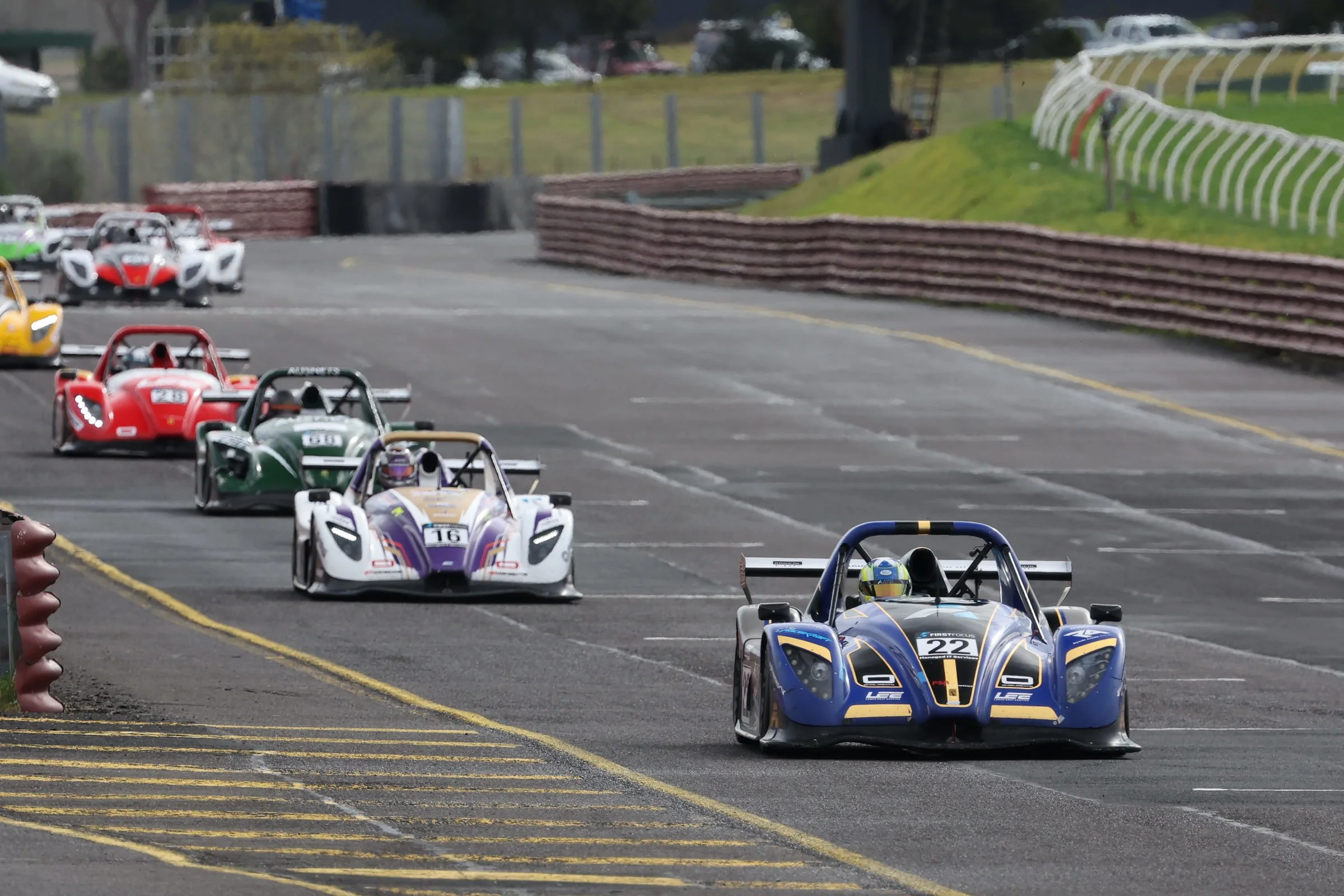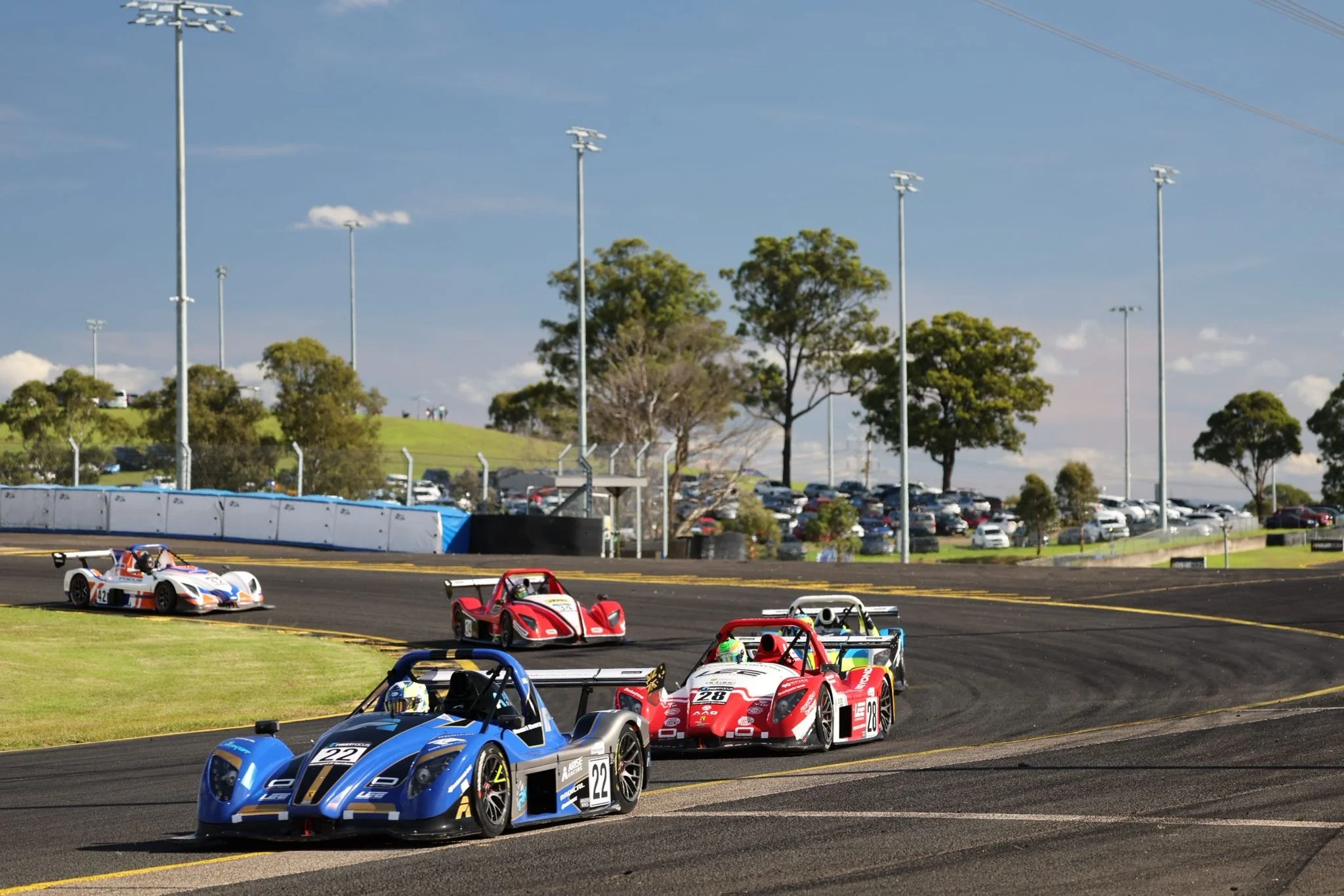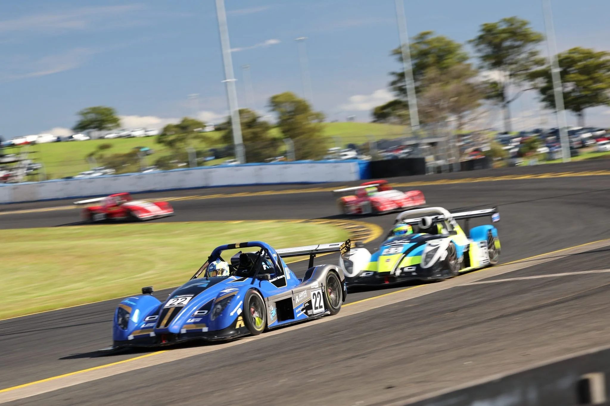 Radical race cars on a racetrack at Sydney Motorsport Park during a race, with a grassy area, trees, and parking lot in the background. Number 22 on the car leading the race.  #SpeedSeries #SMP #RadicalCupAustralia #ruairiavern