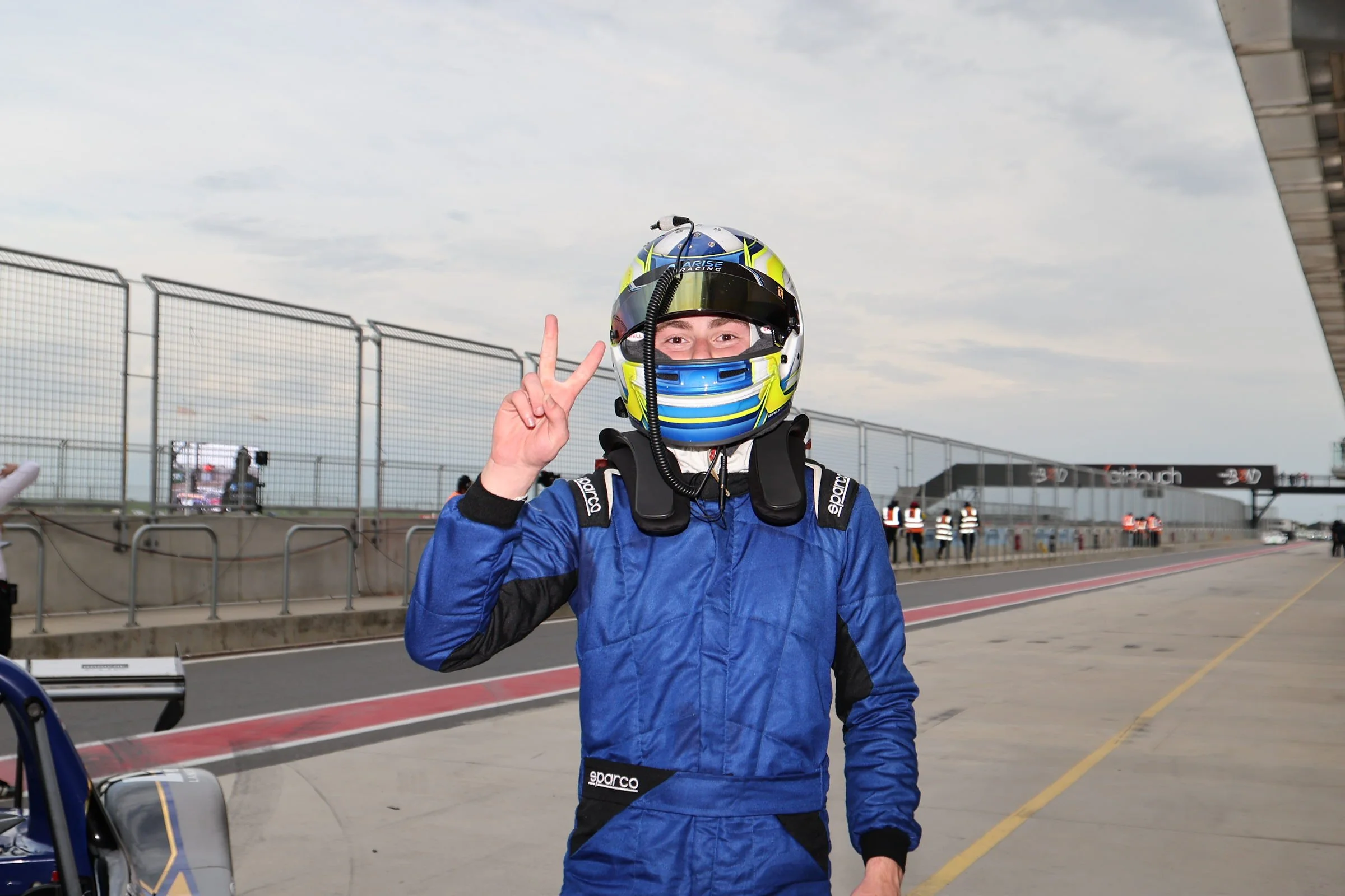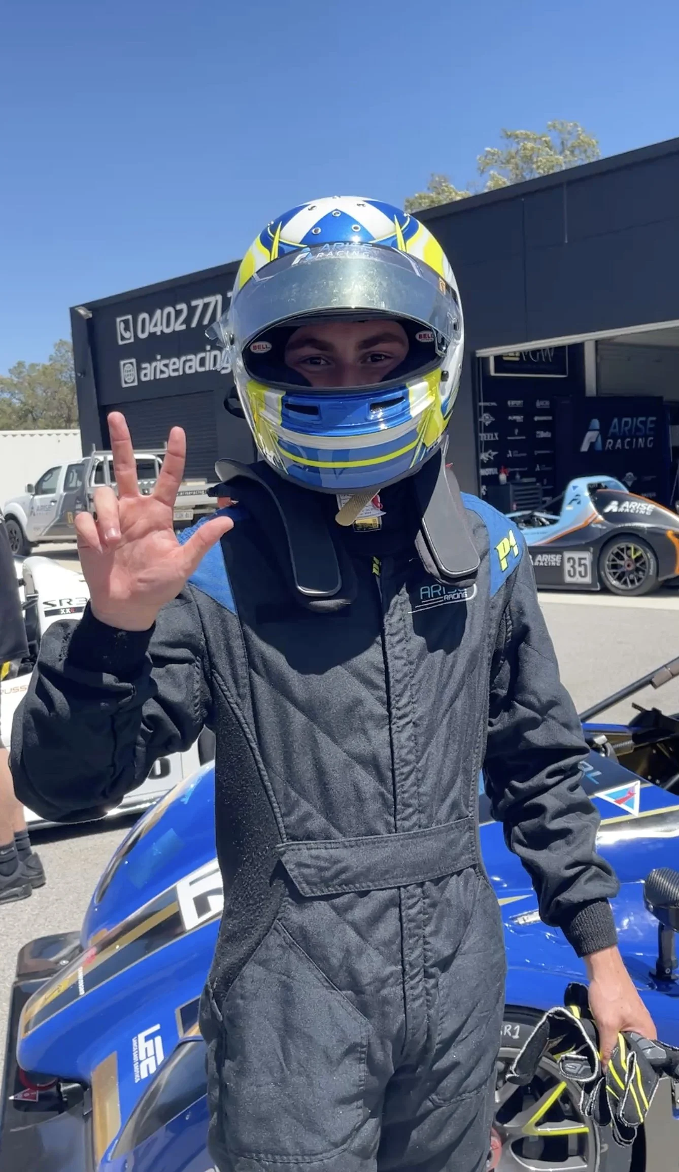 A race car driver in a black racing suit and helmet making a third place hand gesture while standing next to a blue Radical race car in the garage area. #ruairiavern #Arise