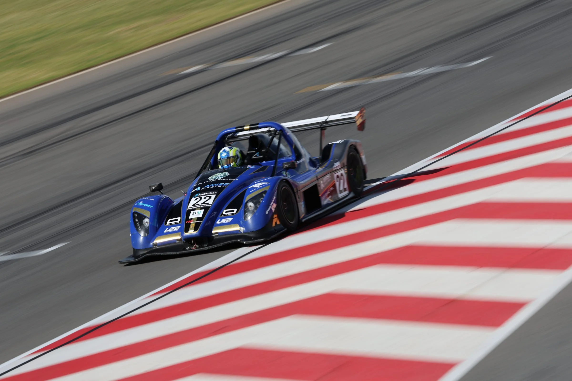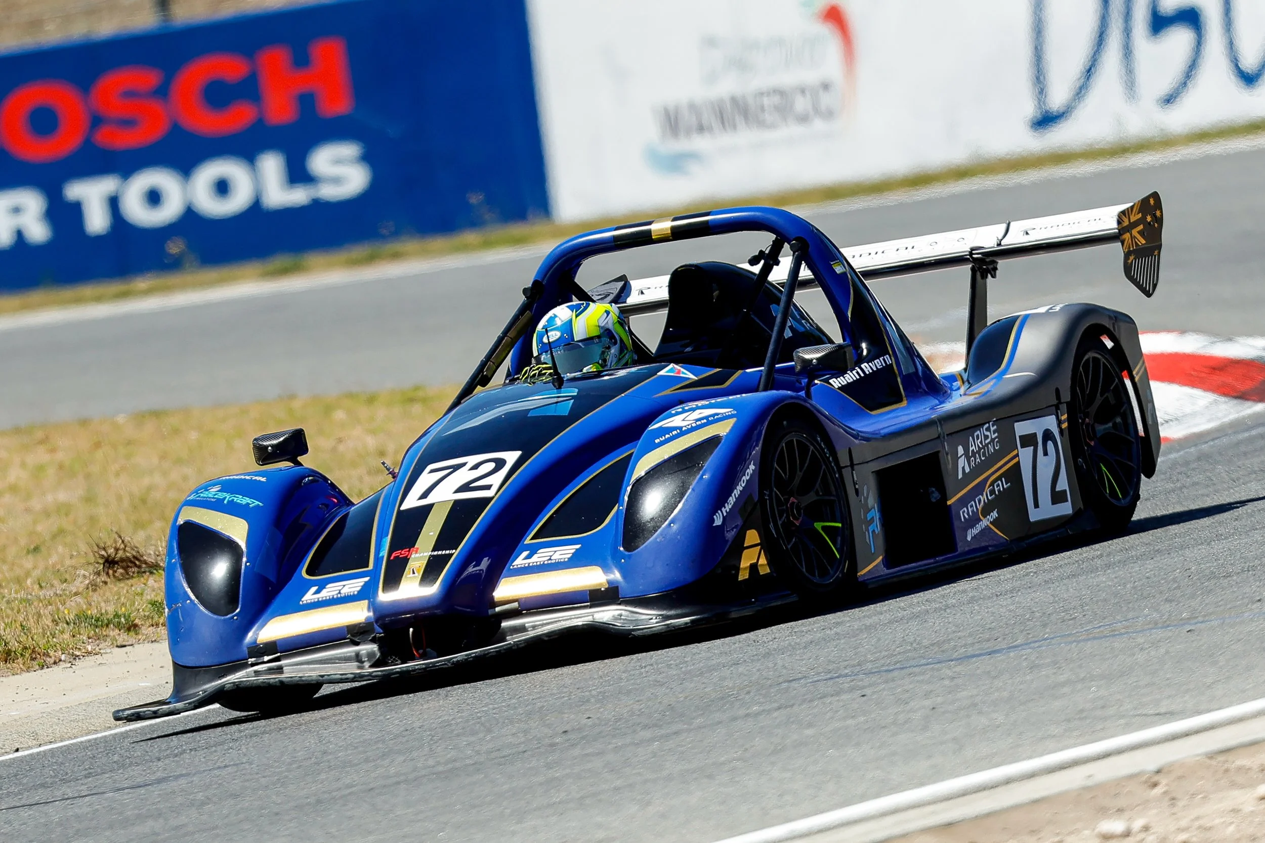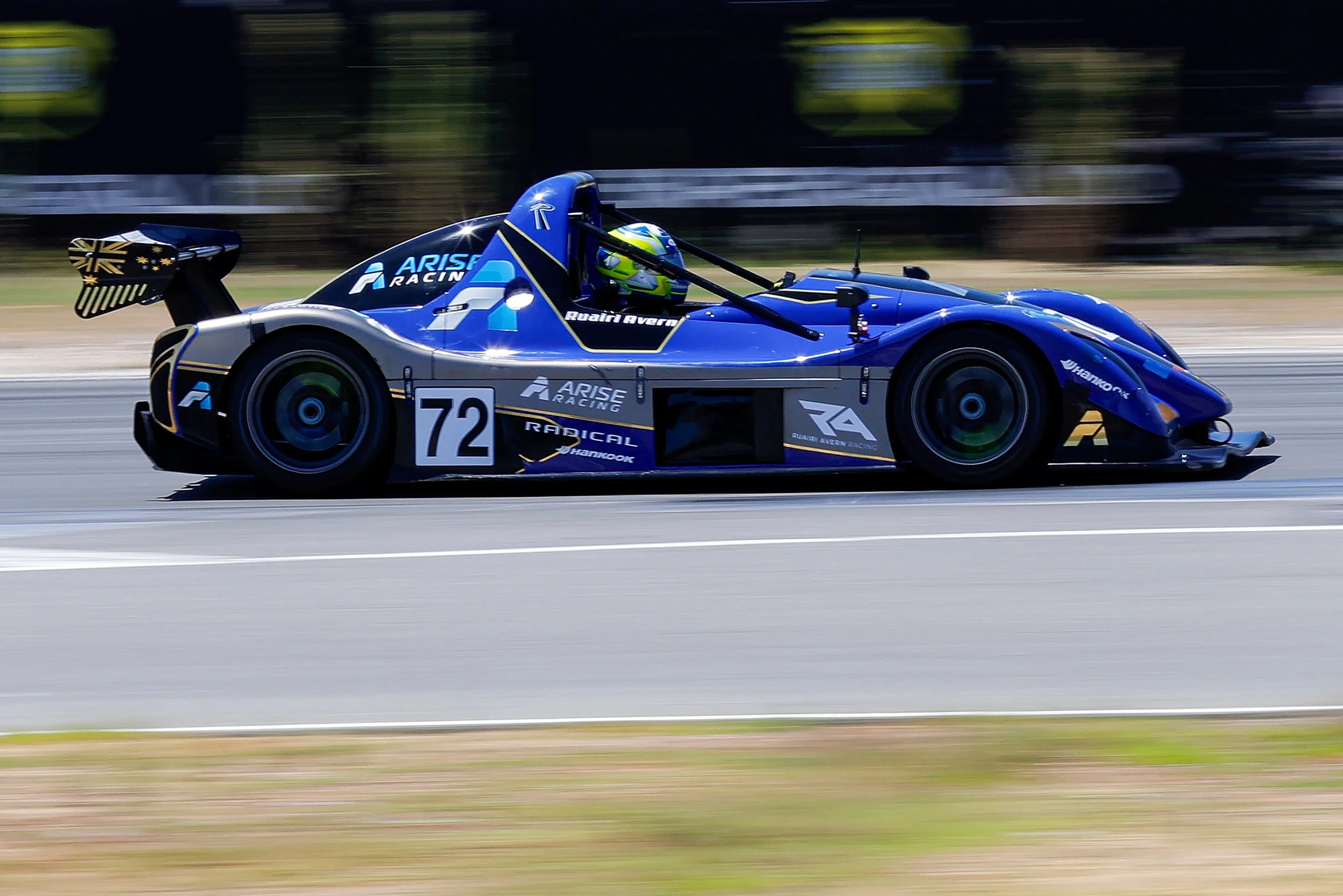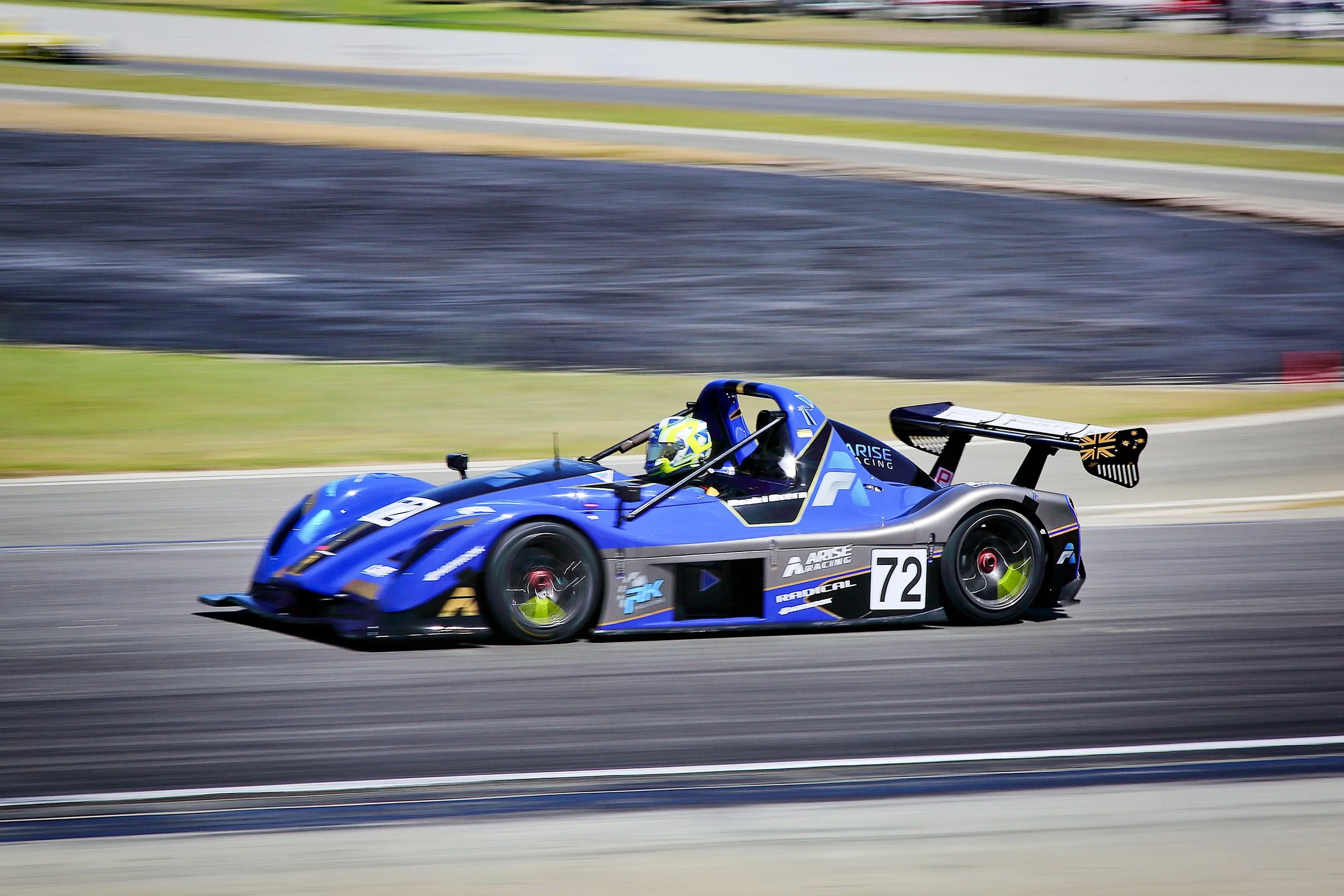 Blue Radical race car with the number 72 on the side, speeding on a race track at Carco.com Raceway, Perth WA with driver Ruairi Avern wearing a yellow and blue helmet. #FSR #Arise #ruairiavern