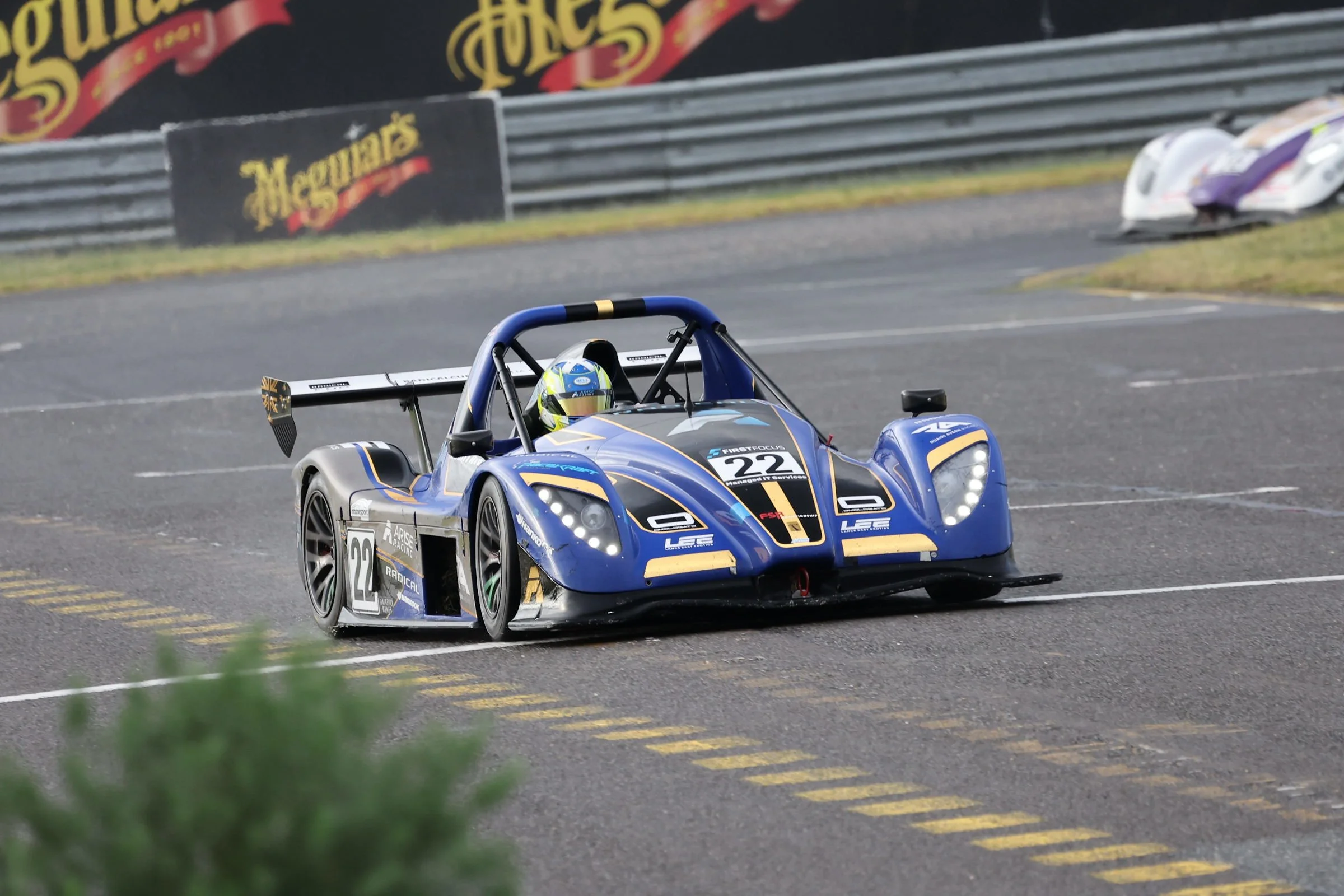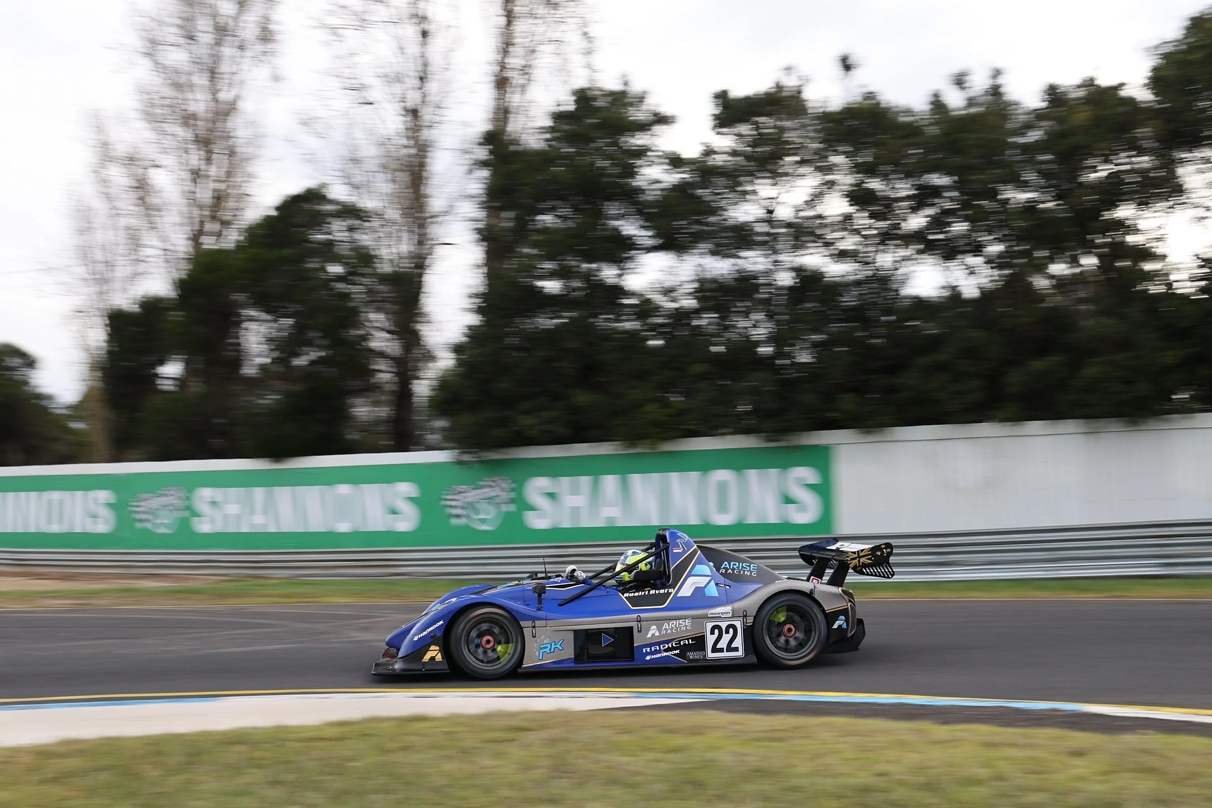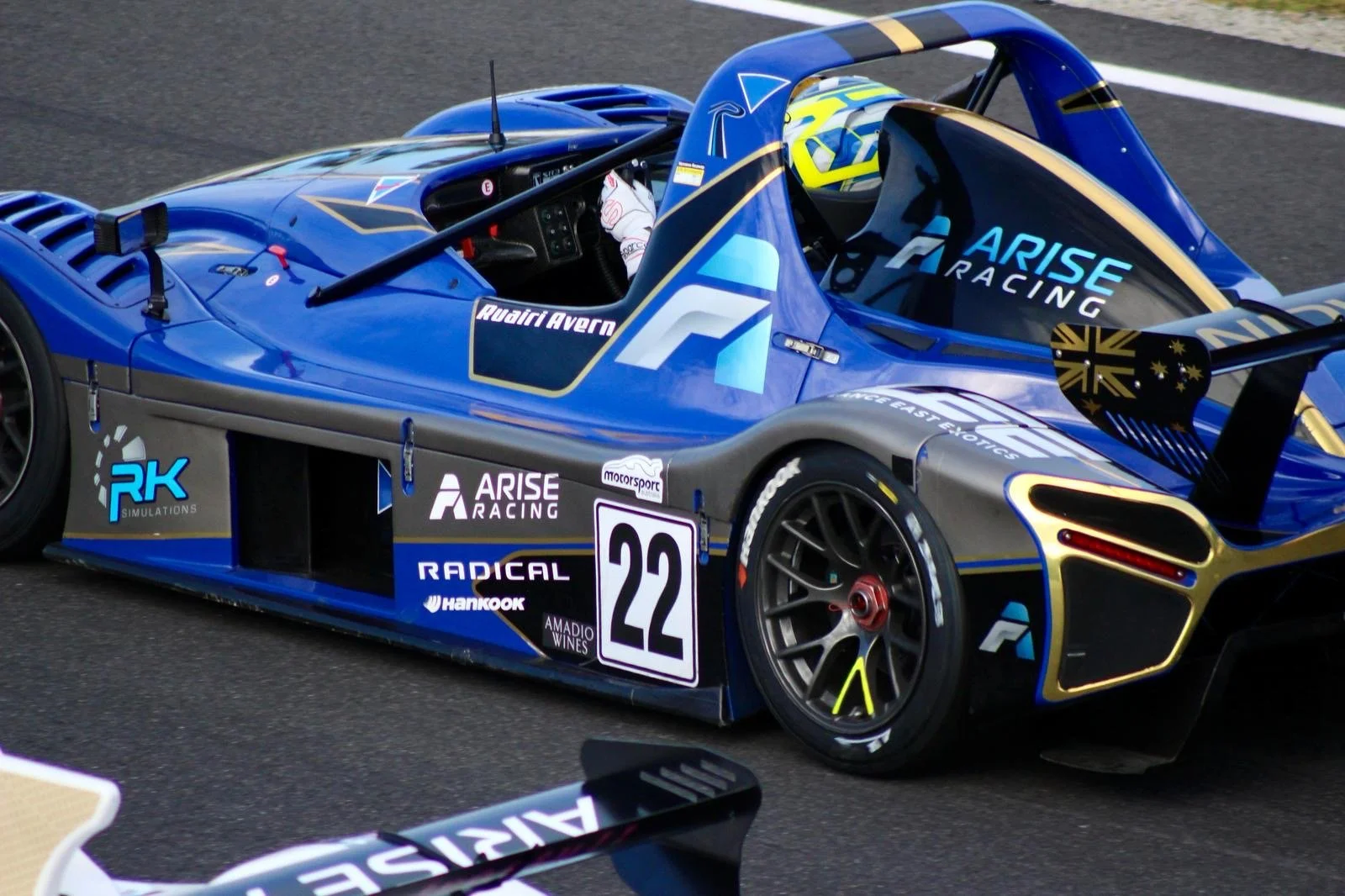 Blue racing Radical sports car with number 22, on a race track, driven by a driver in a blue helmet. The car has various sponsor logos, including Arise Racing and RaceKraft Simulations. #SpeedSeries #RadicalCupAustralia #ruairiavern