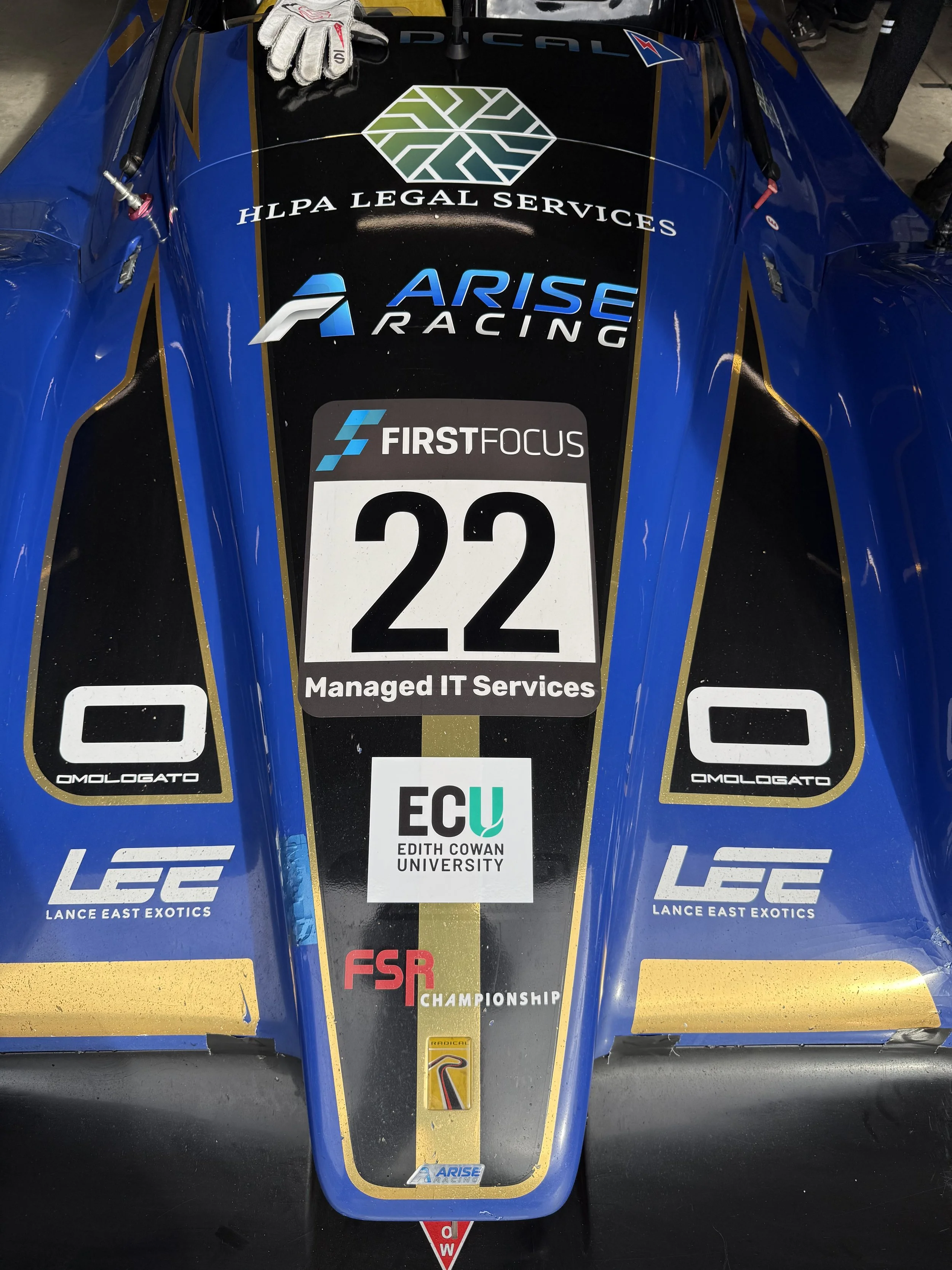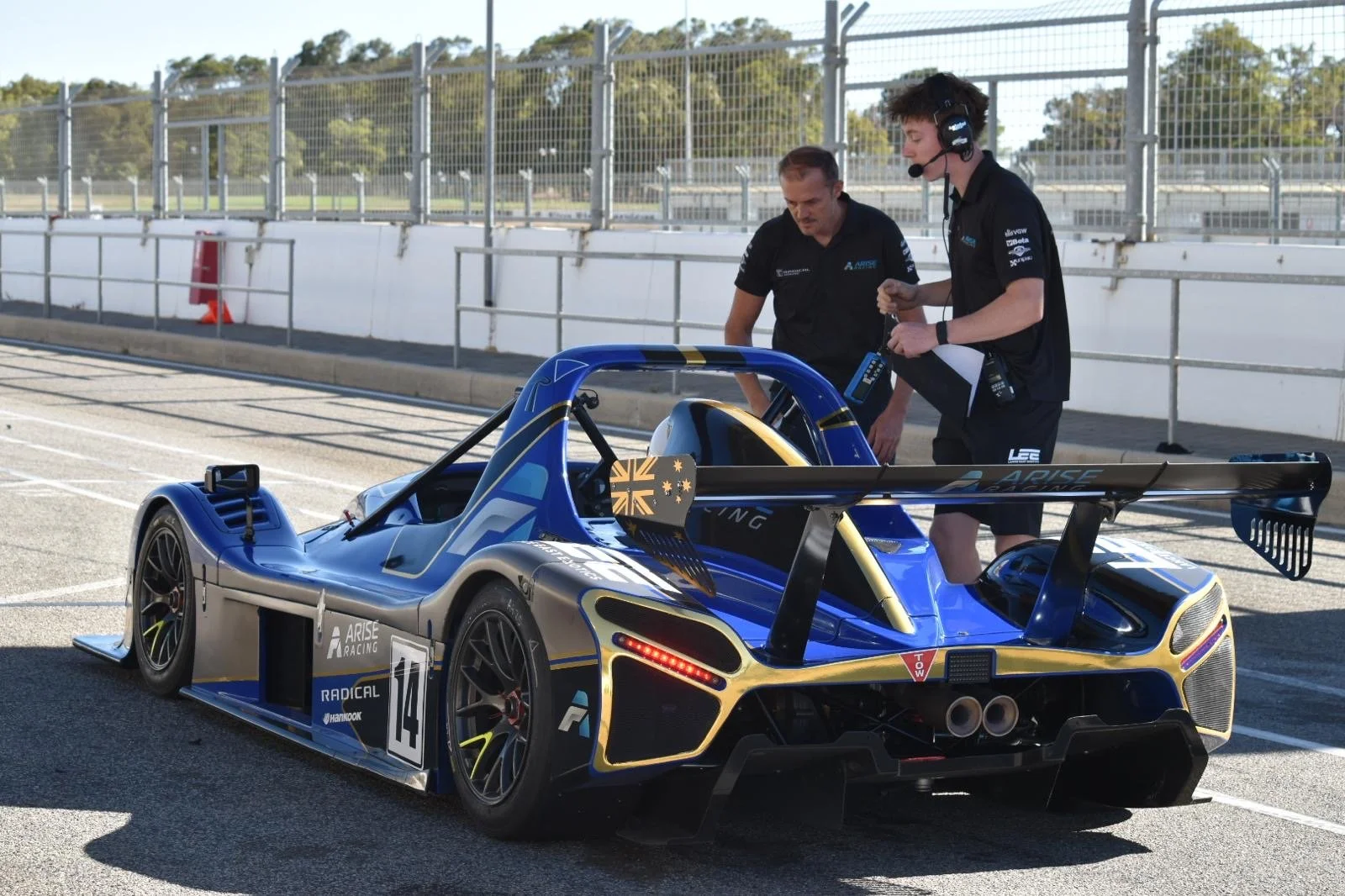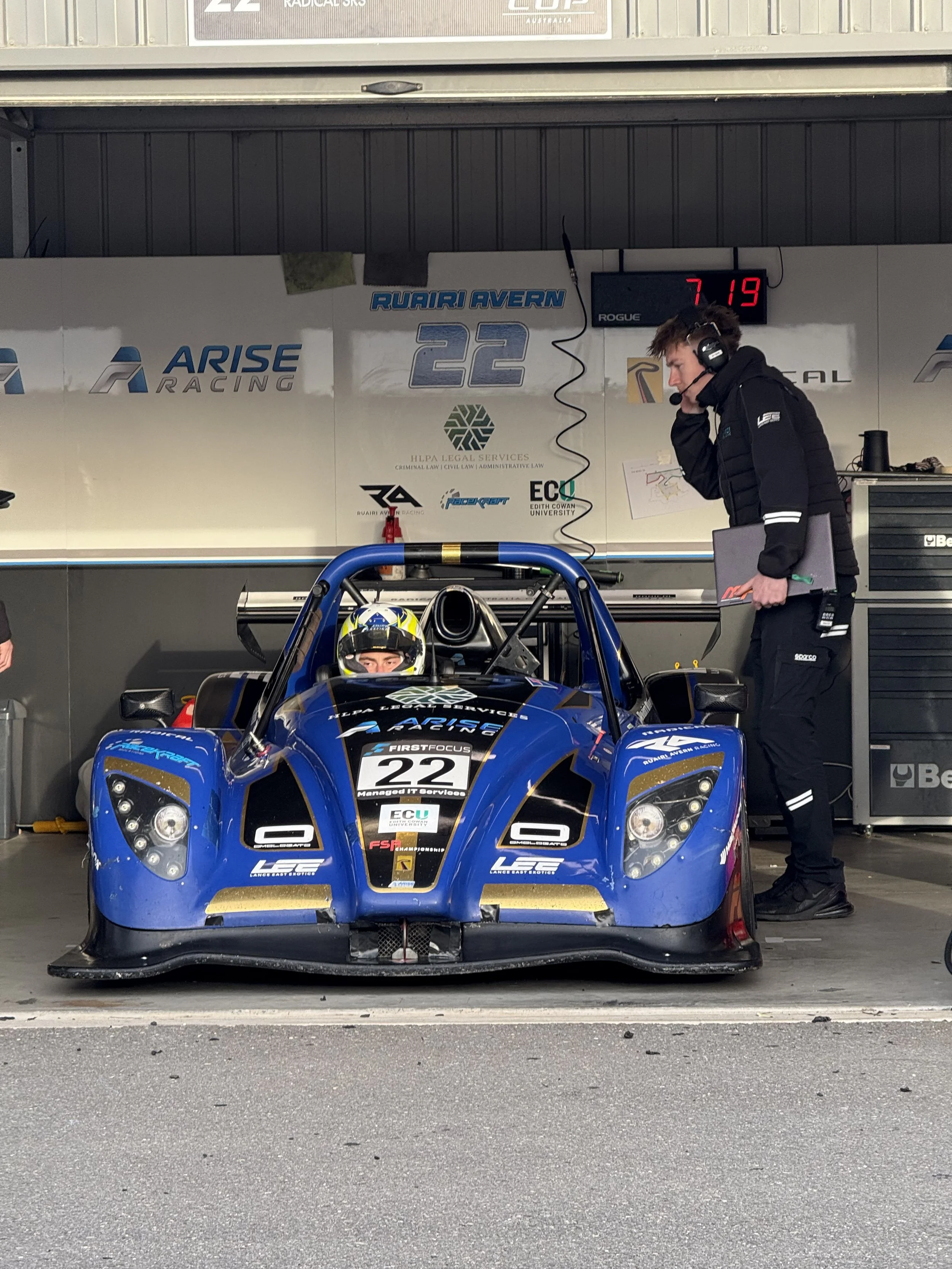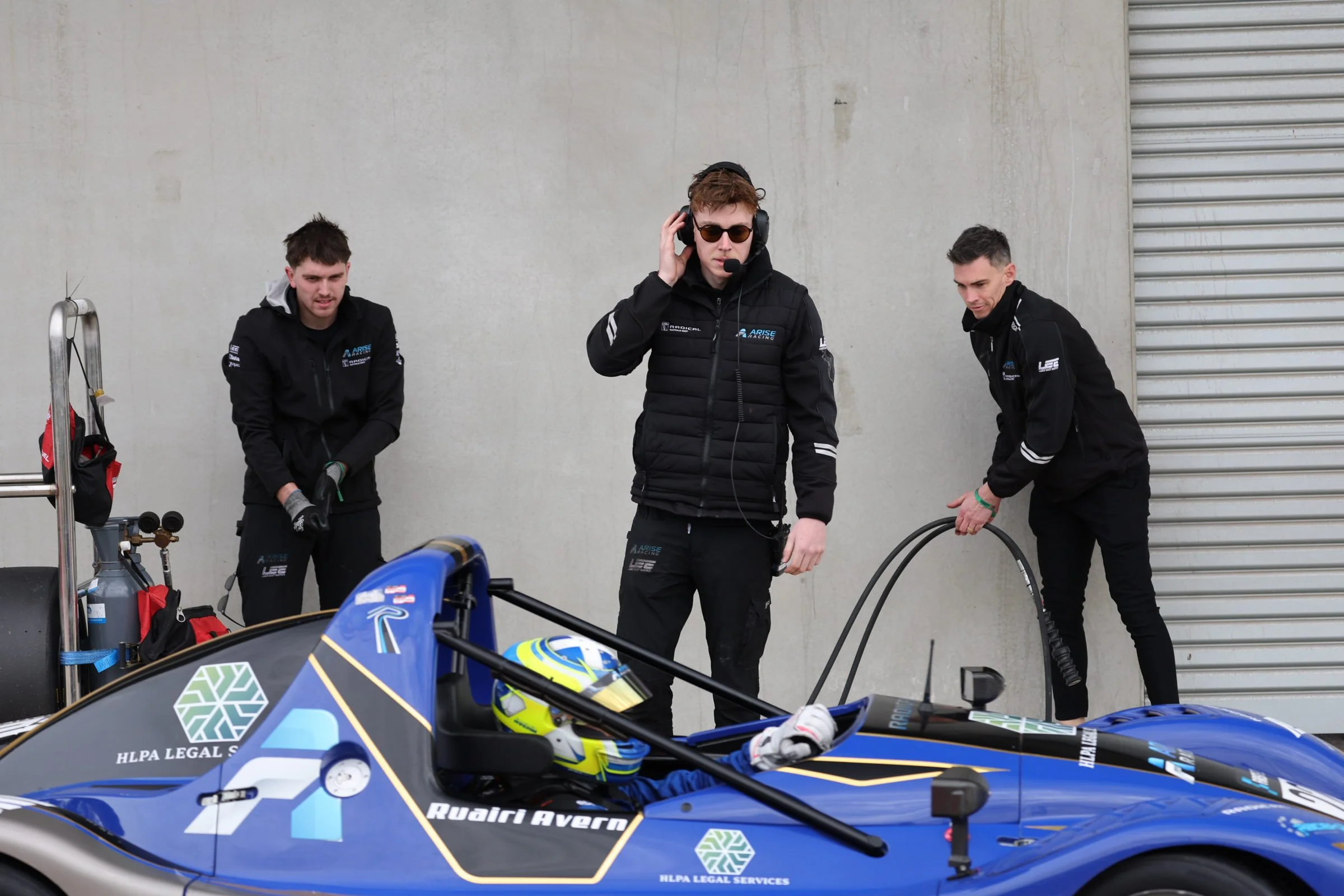 Ruairi Avern race car driver standing next to a blue Radical race car holding a helmet, in front of a building with ARISE signage. #RadicalCupAustralia #ruairiavern