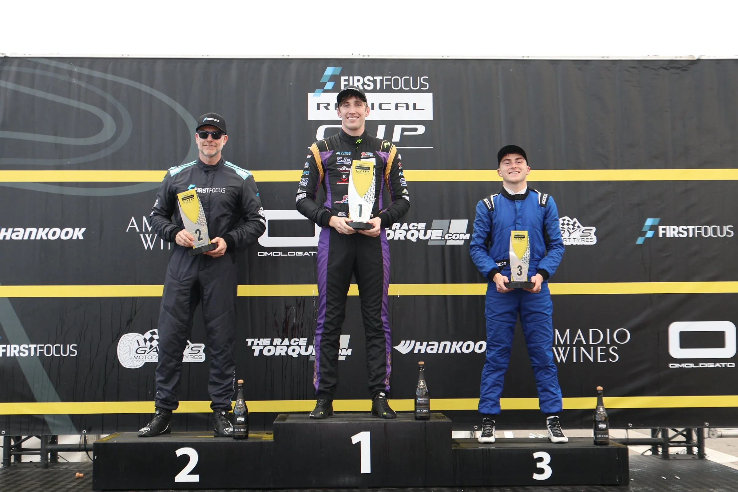 Race car drivers on podium at awards ceremony, first place in center, second place to the left, third place to the right, holding trophies, with a backdrop displaying First Focus Radical Cup Australia and other sponsors. #ruairiavern #SMP #RadicalCup