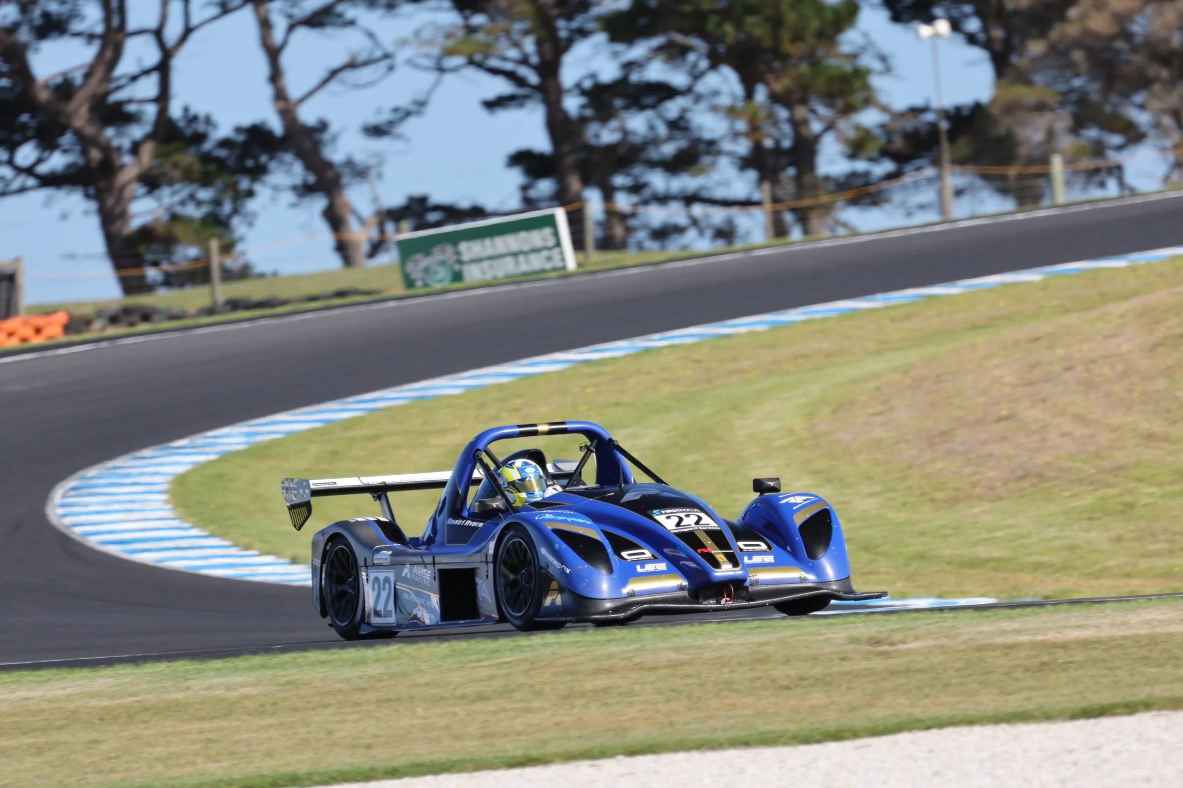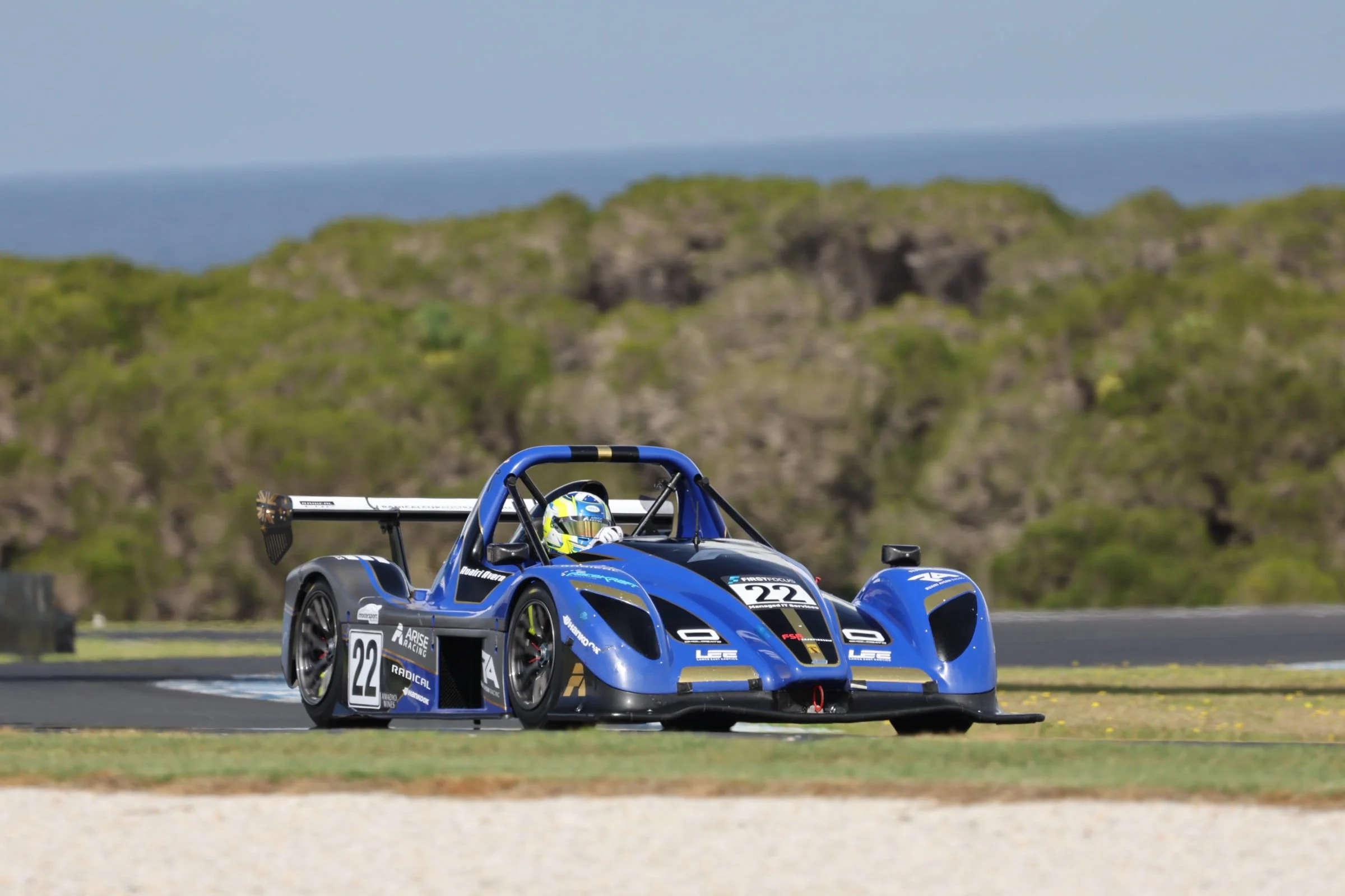 Blue Radical race car on a racetrack with a driver helmet visible, numbers 22, with a large rear wing and aerodynamic design.  Phillip Island GP Circuit Melbourne Australia. #SpeedSeries #RadicalCupAustralia #ruairiavern