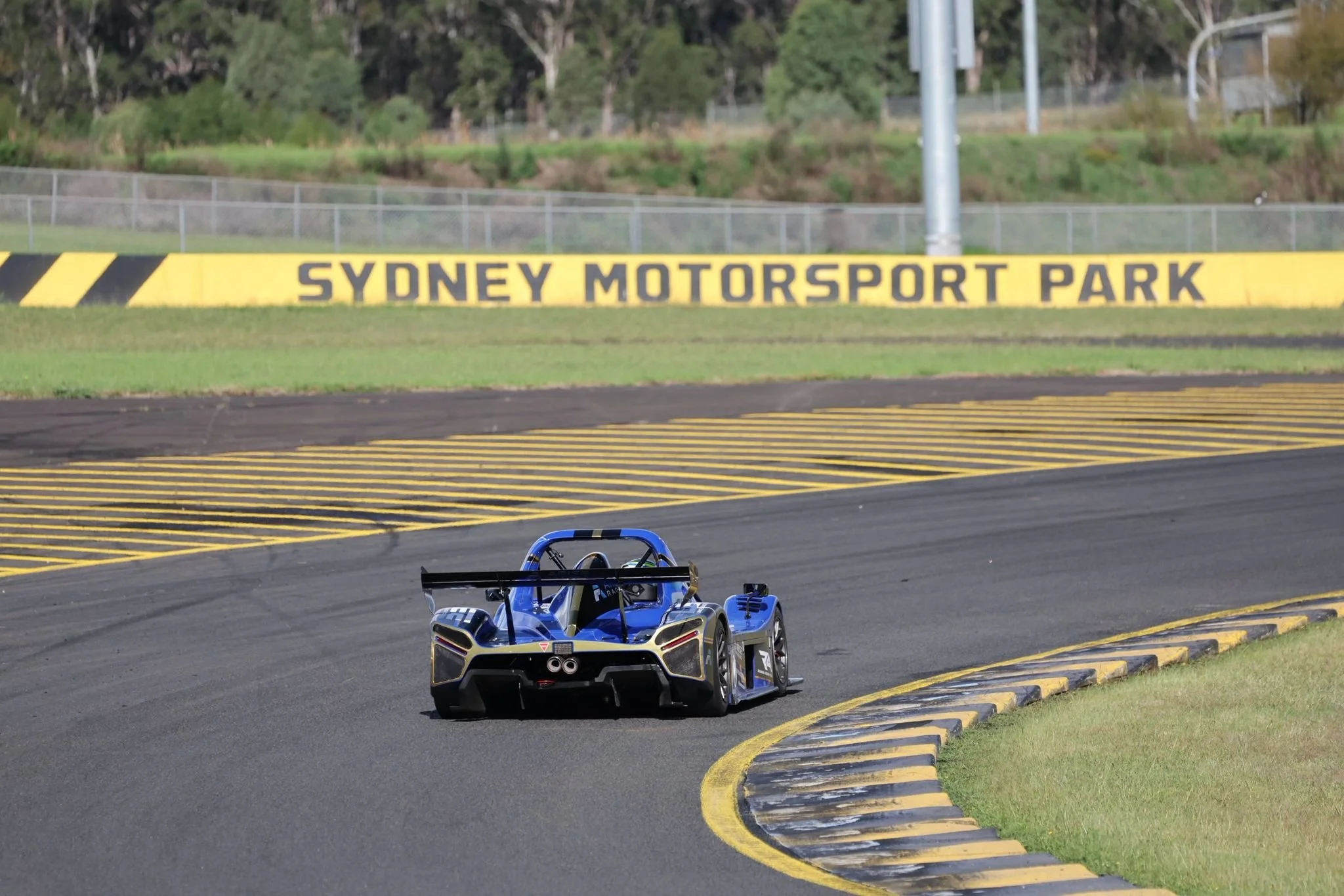 A blue Radical race car on a high speed track at Sydney Motorsport Park with a yellow and black barrier in the background bearing the name. #SMP #SpeedSeries #RadicalCupAustralia #ruairiavern