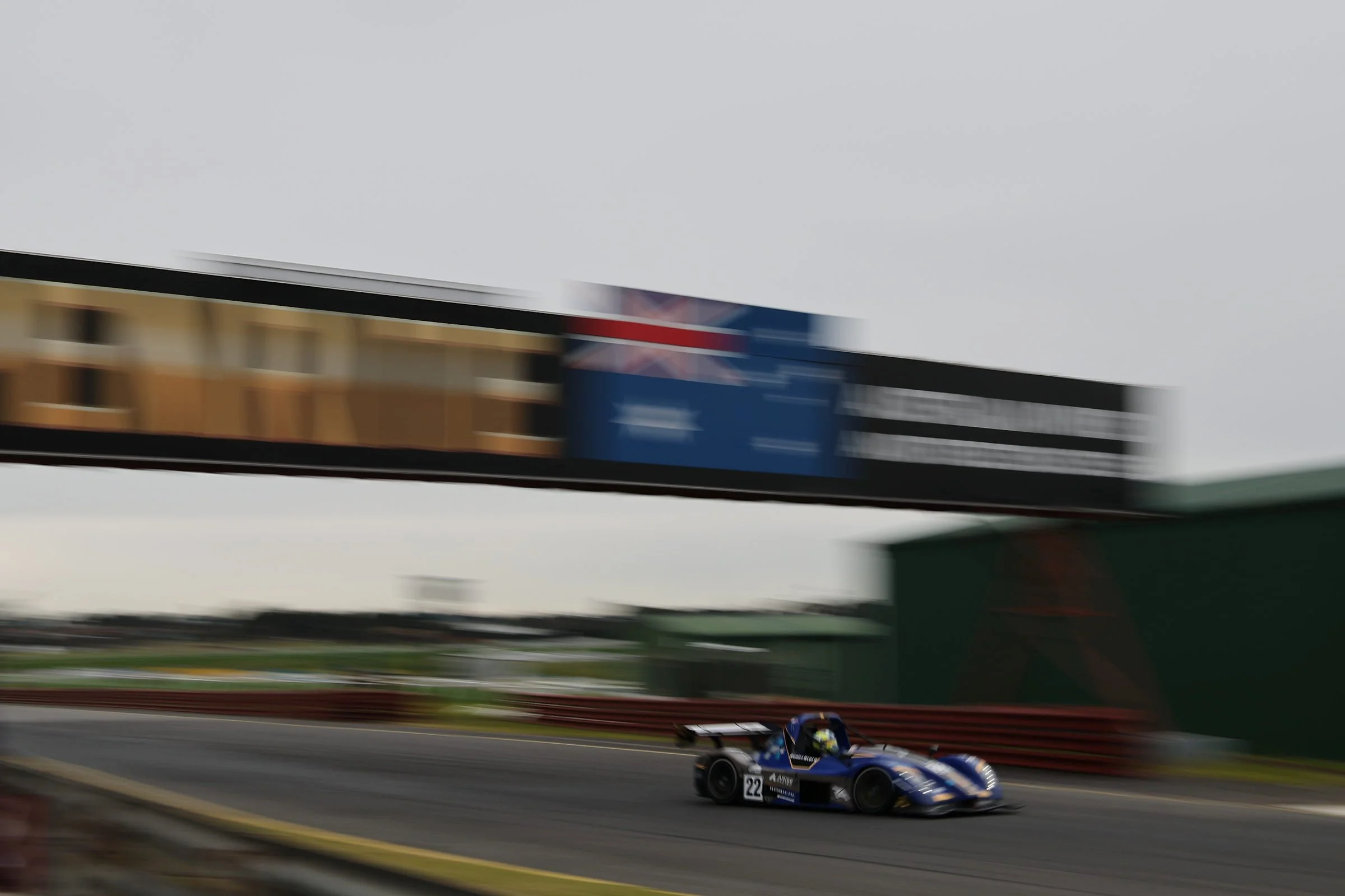 A blue Radical race car with the number 22 on its side, speeding on a race track at Phillip Island GP Circuit with blurred background and a driver wearing a helmet. #SpeedSeries #RadicalCupAustralia #ruairiavern