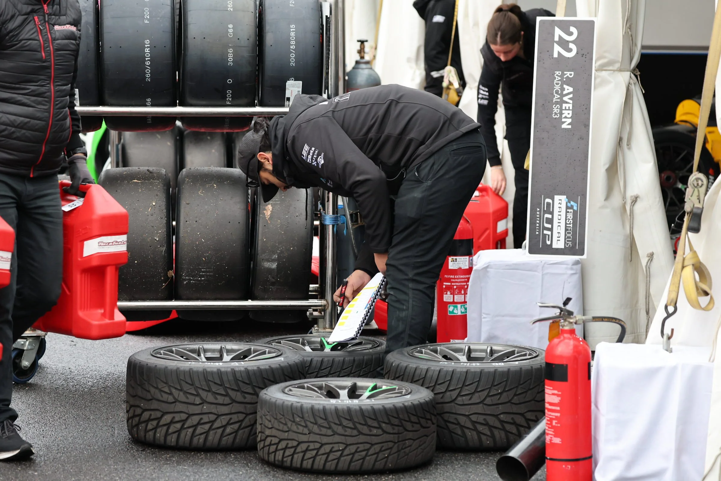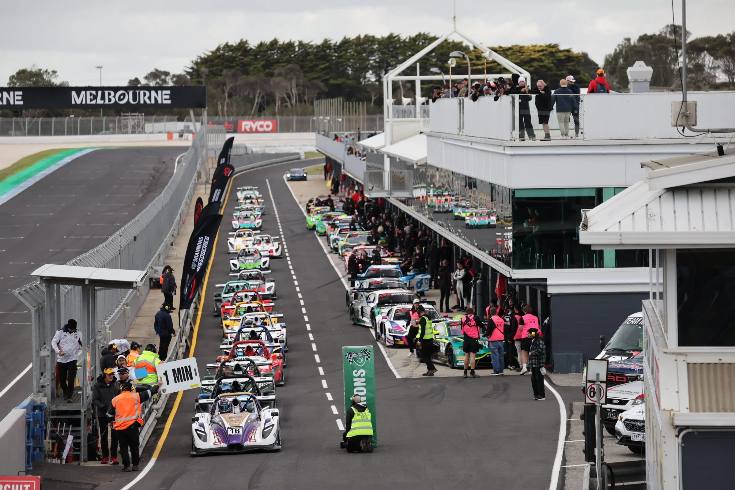 Radical race cars lined up in the outgrip at a racing event at Phillip Island GP circuit, Melbourne, Australia, with spectators on the upper balcony and team members preparing the cars. #SpeedSeries #RadicalCupAustralia #ruairiavern