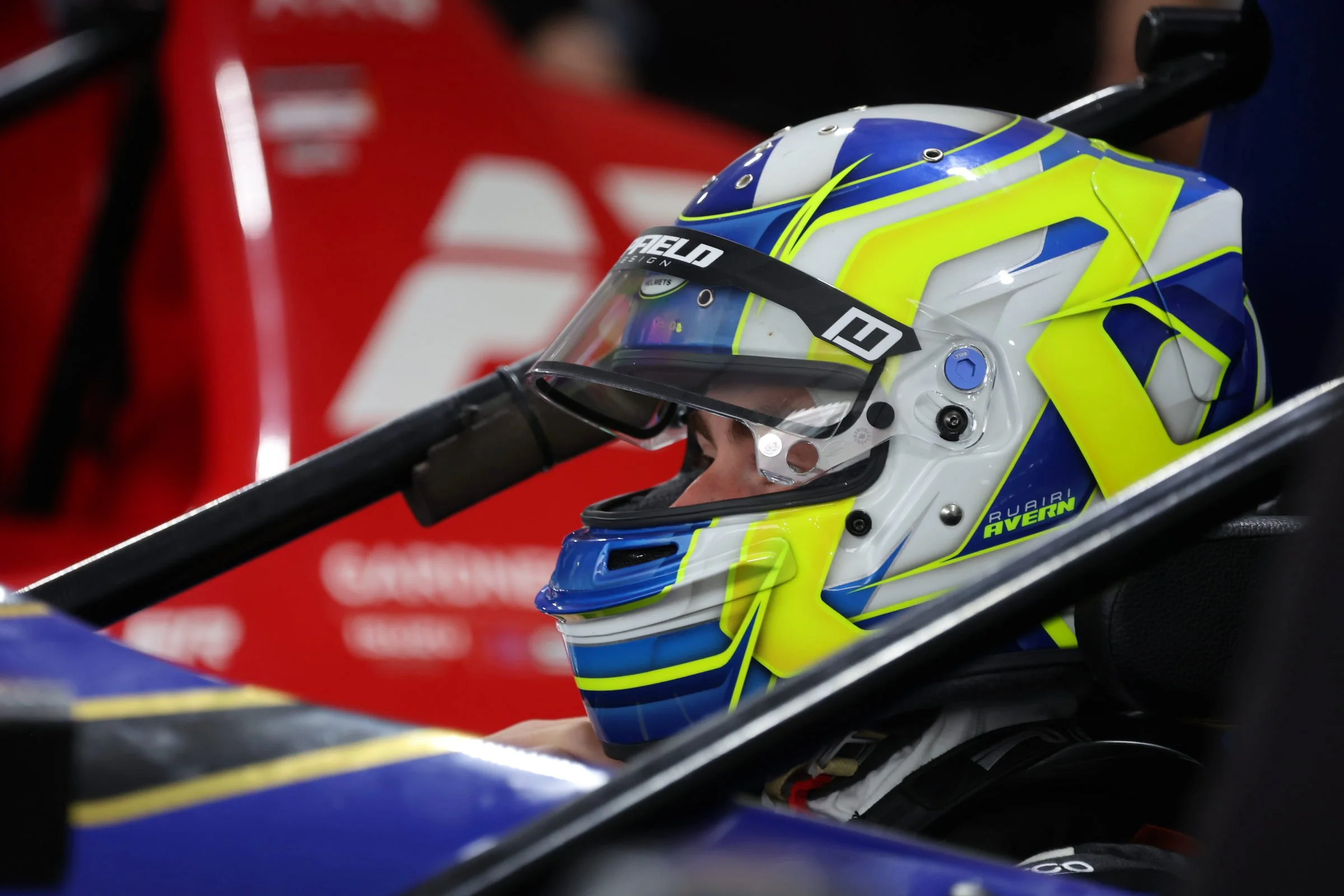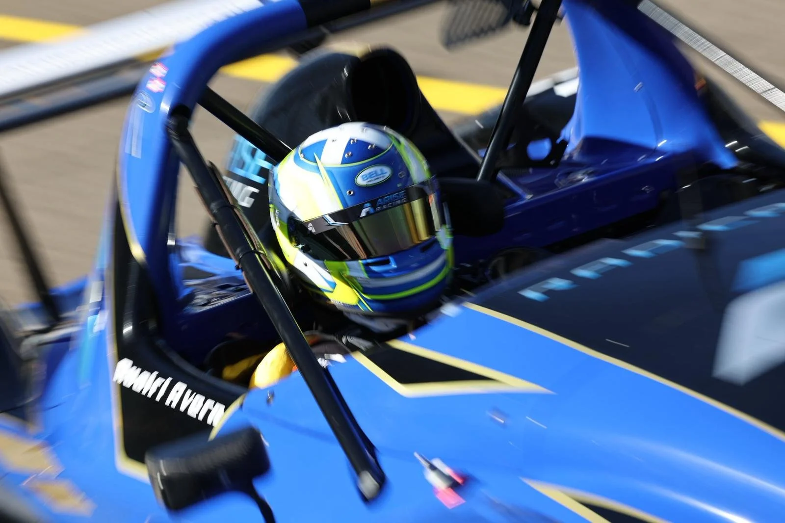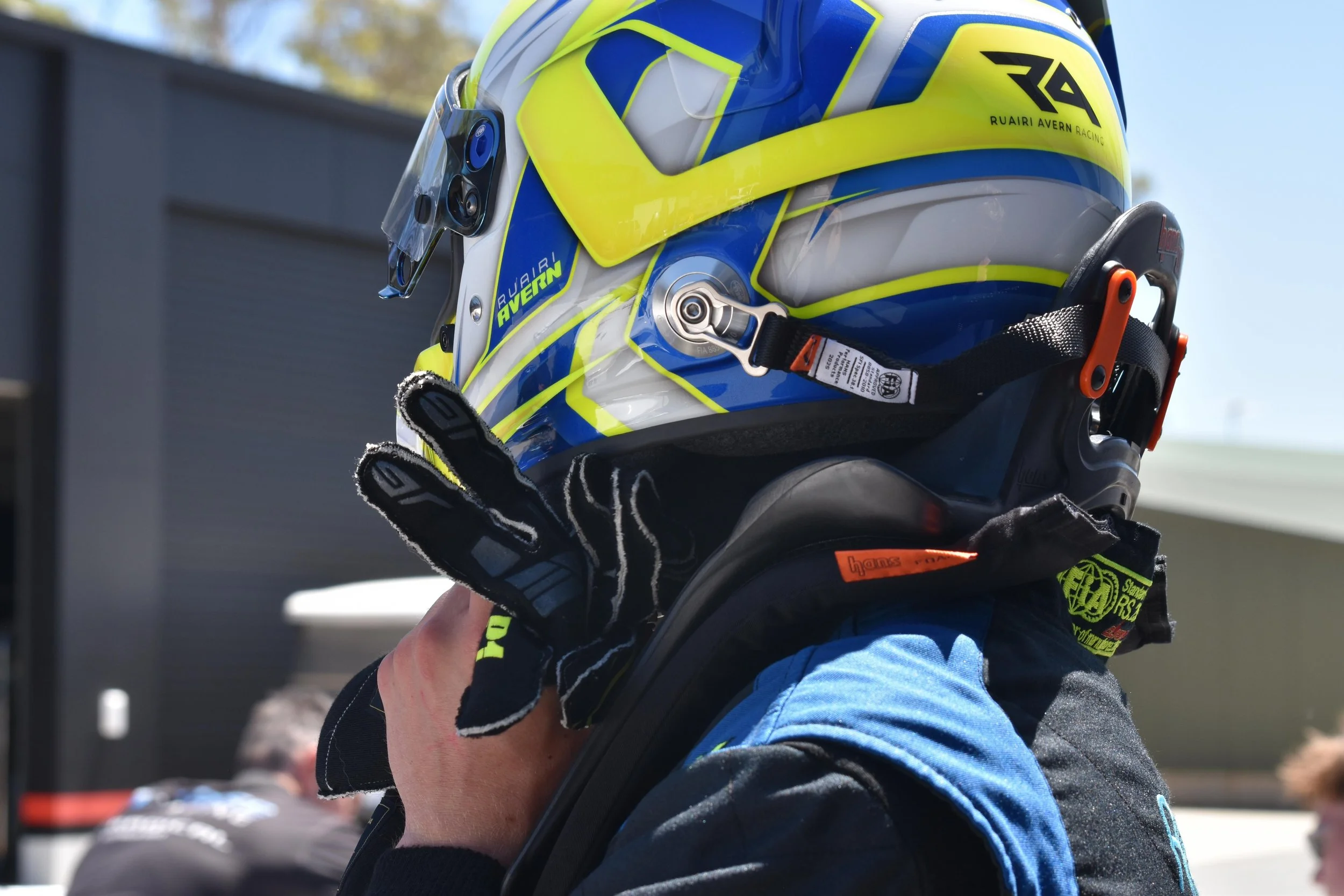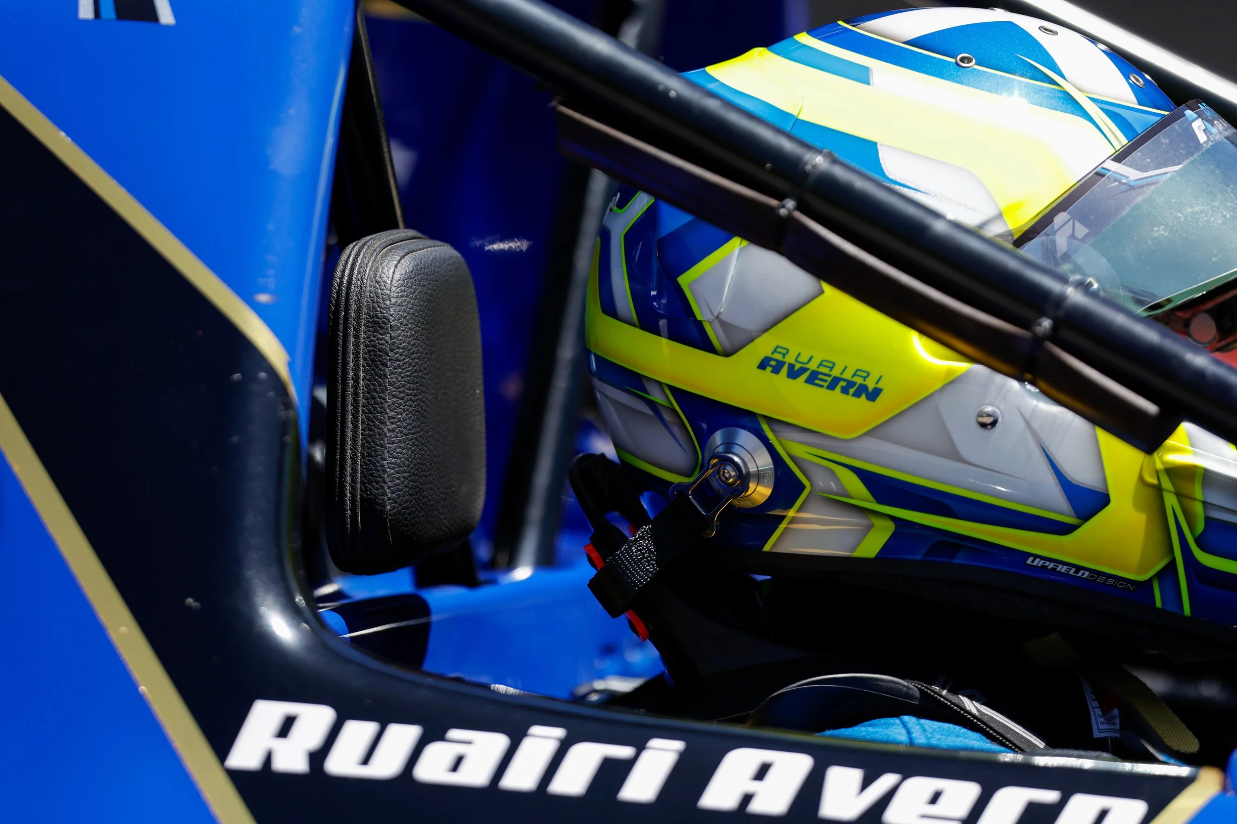 Close-up of a racing helmet with blue, white, and yellow design inside a blue race car. The helmet has text that reads 'Ruairi Avern.' The interior of the car includes a black headrest and safety bar visible in the background. #ruairiavern #Arise