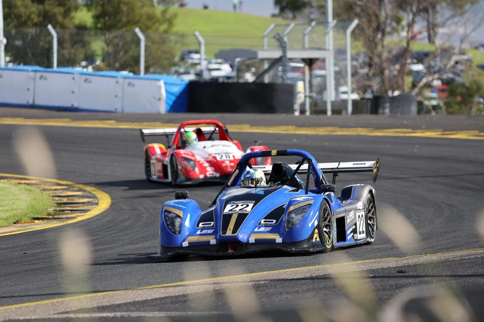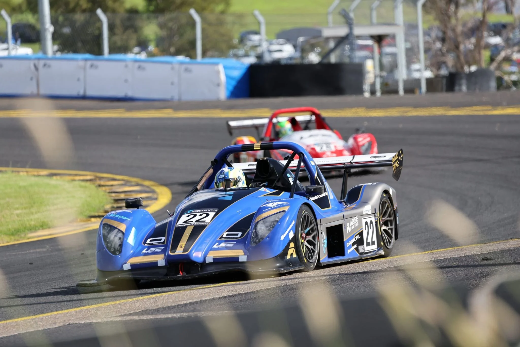 A blue Radical race car with the number 22 on it is taking a turn on a race track at Sydney Motorsport Park, with a red race car following behind. #SMP #RadicalCupAustralia #SpeedSeries #ruairiavern