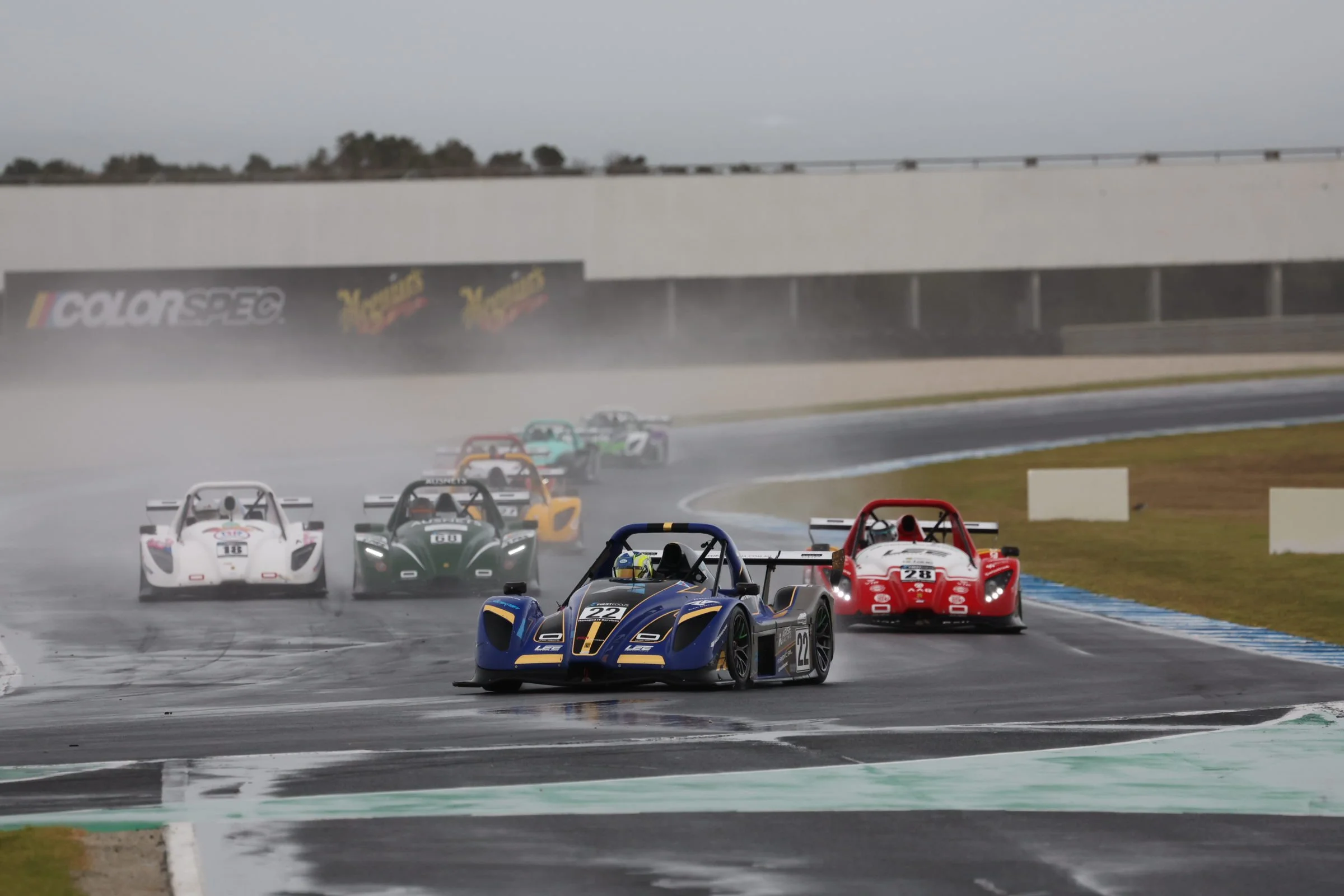 Radical race cars on a wet track at Phillip Island GP Circuit during a race under cloudy skies, with several colorful cars trailing behind a blue and black car and a red and white car leading.  #SpeedSeries #RadicalCupAustralia #ruairiavern