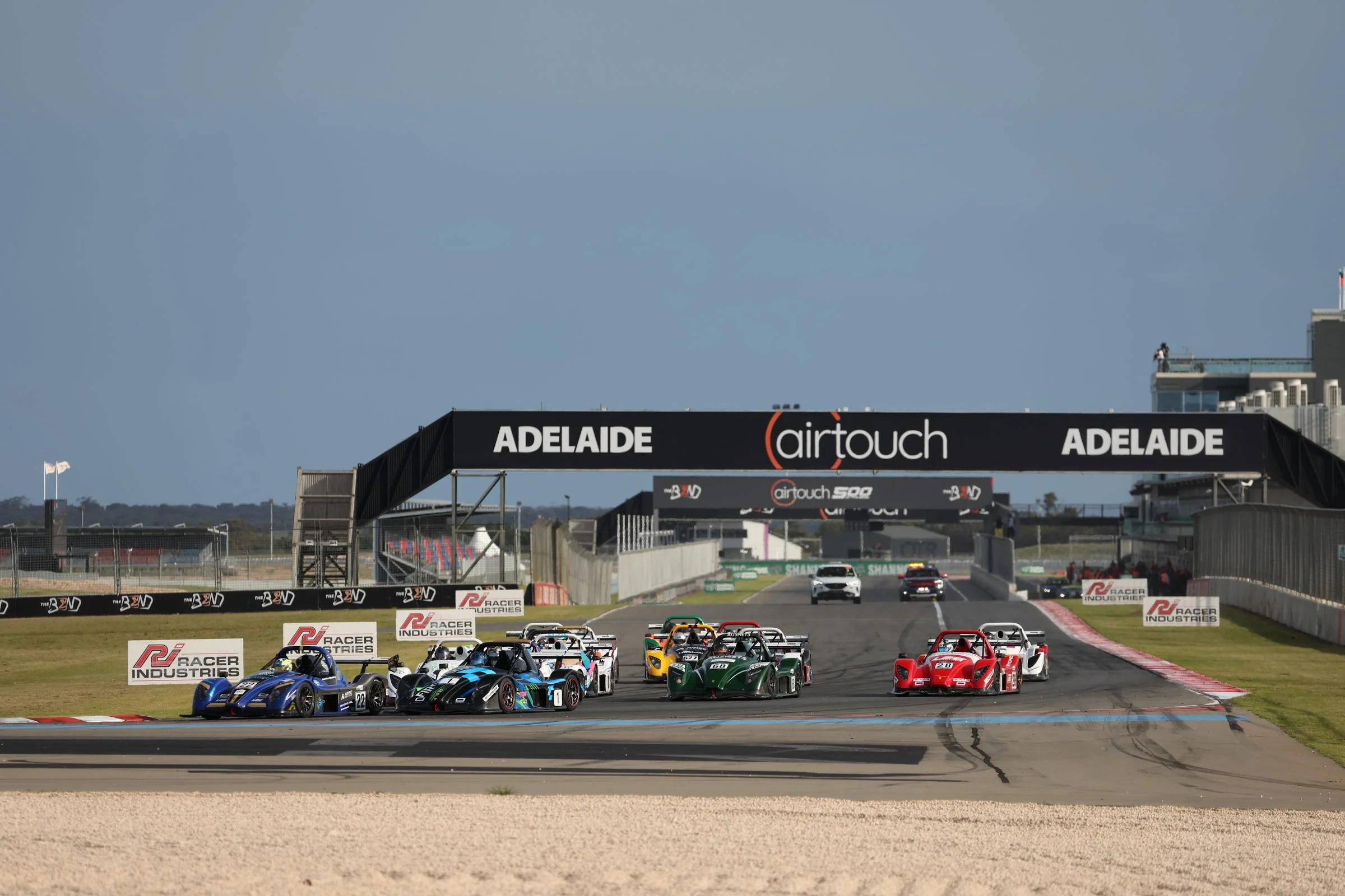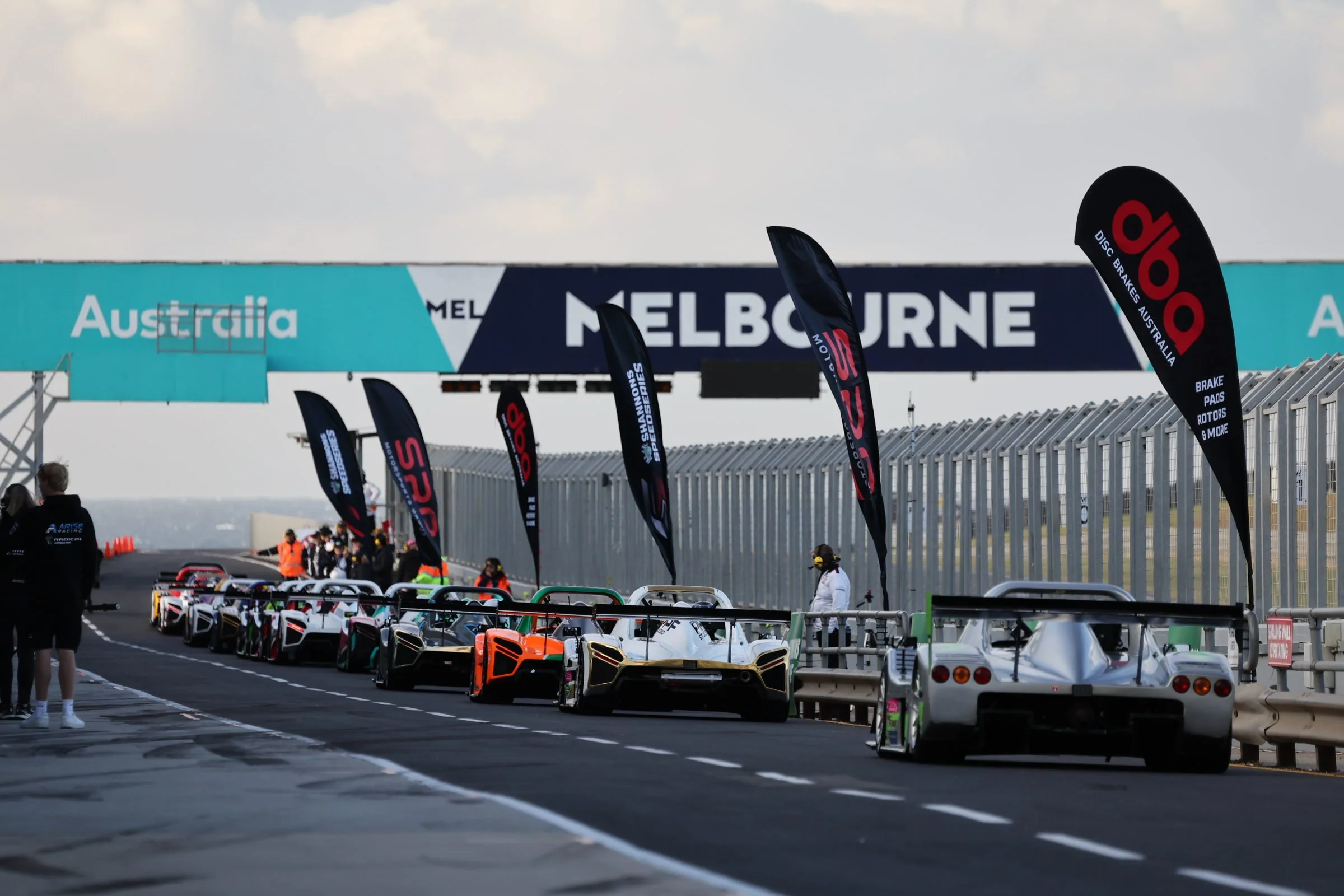 Radical race cars lined up on outgrip at the Phillip Island GP Circuit, Melbourne Australia, with flags and a large sign overhead displaying "Australia" and "Melbourne." #SpeedSeries #RadicalCupAustralia #ruairiavern