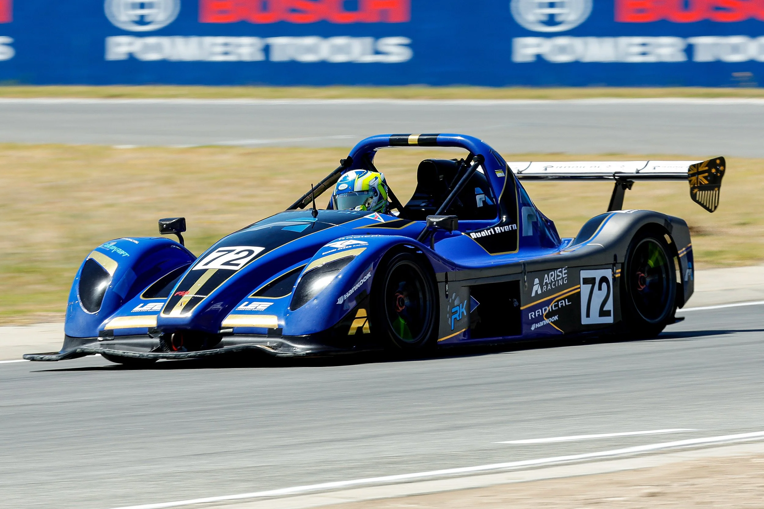 A blue Radical racing car #72 driving on a race track at Carco.com Raceway, Wanneroo Perth WA,  at high speed with a driver Ruairi Avern wearing a helmet. #ruairiavern #Arise