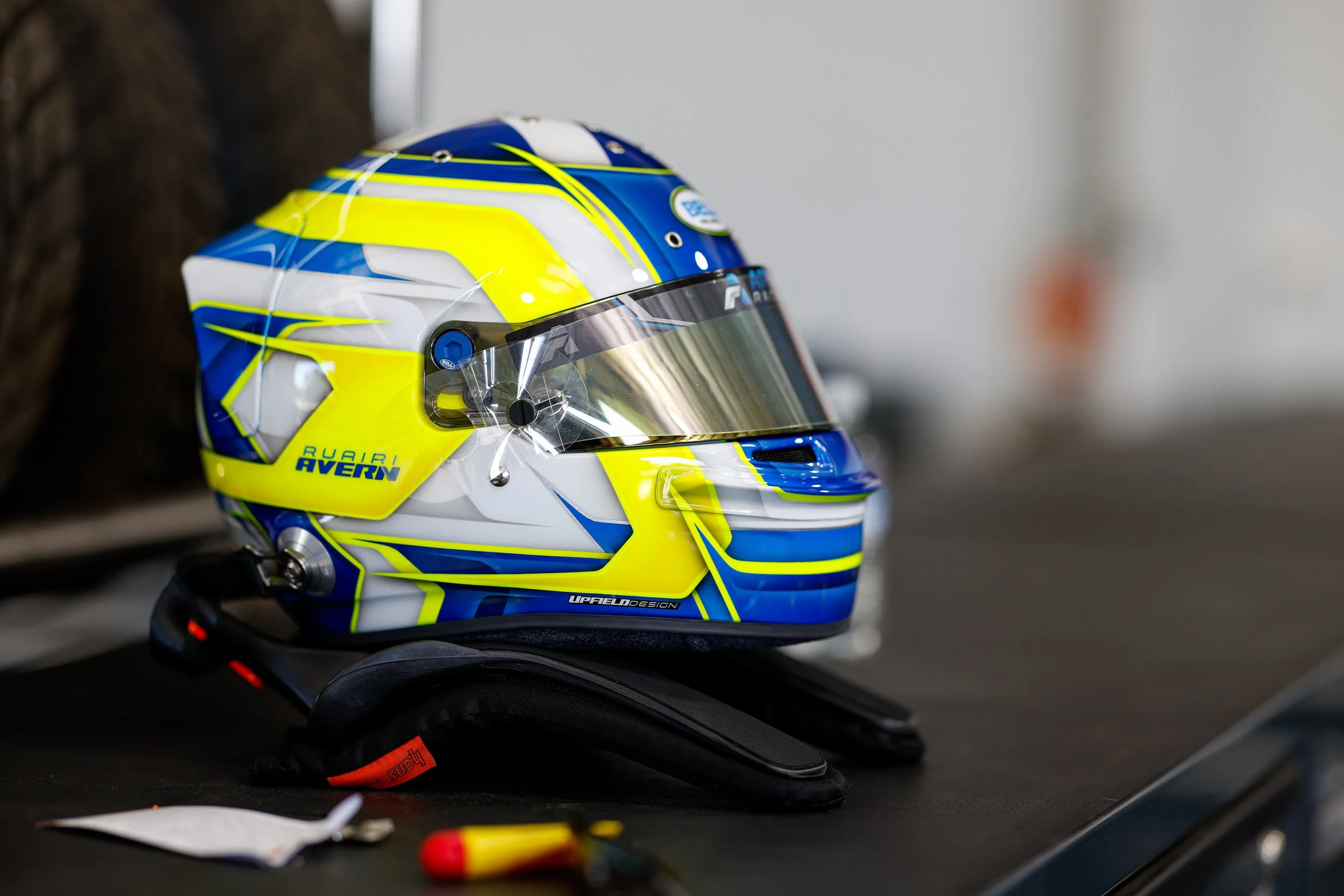 Colorful racing helmet for Ruairi Avern with blue, yellow, and white design placed on a black headrest on a workbench. #ruairiavern