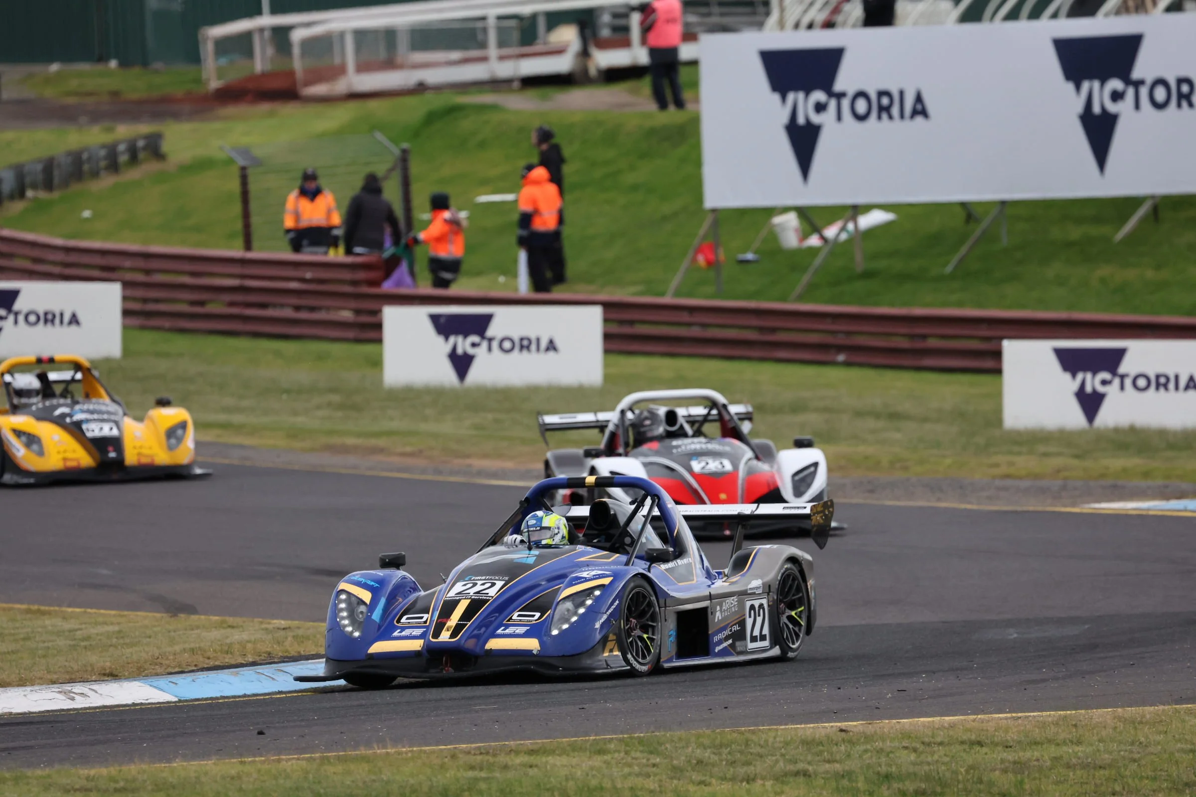 Two Radical race cars on a track, blue and black car with number 22 in front, followed by a yellow, black, and white car, with other cars blurred in the background during a race.  Sydney Motorsport Park. #SMP #RadicalCupAustralia #ruairiavern