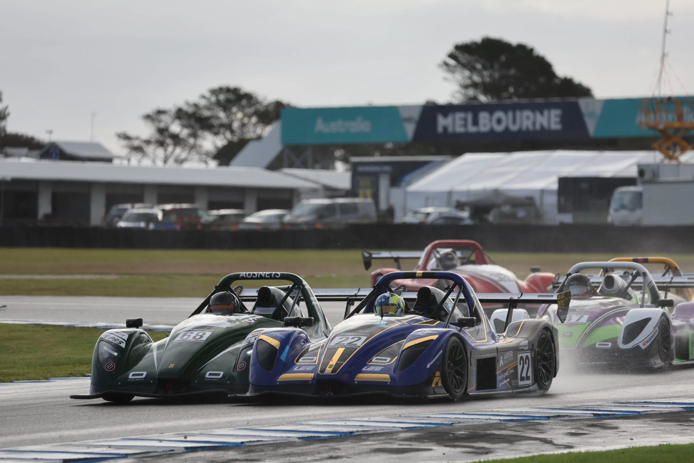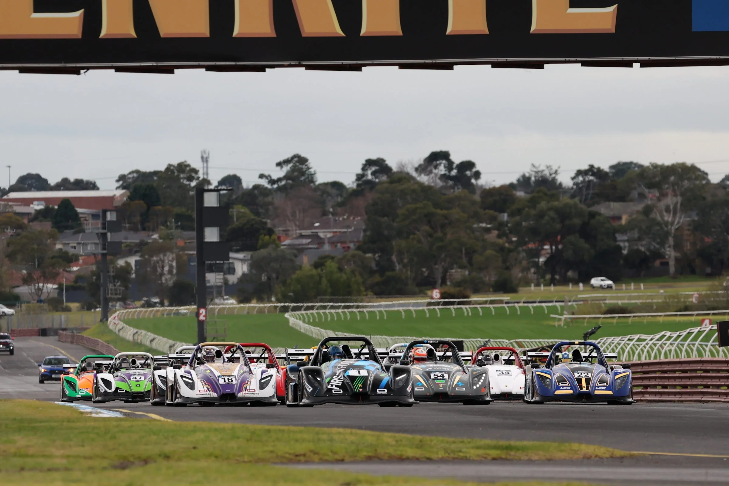 Multiple Radical race cars on a track during a race at Phillip Island GP Circuit, with a large sign reading 'Melbourne' and trees in the background. Melbourne Australia. #SpeedSeries #RadicalCupAustralia #ruairiavern