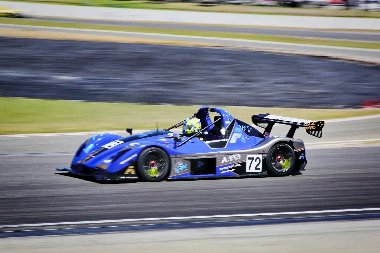 Blue Radical race car with the number 72 on the side driving on a racetrack at Carco.com Raceway, Wanneroo, Perth WA.  #ruairiavern #Arise