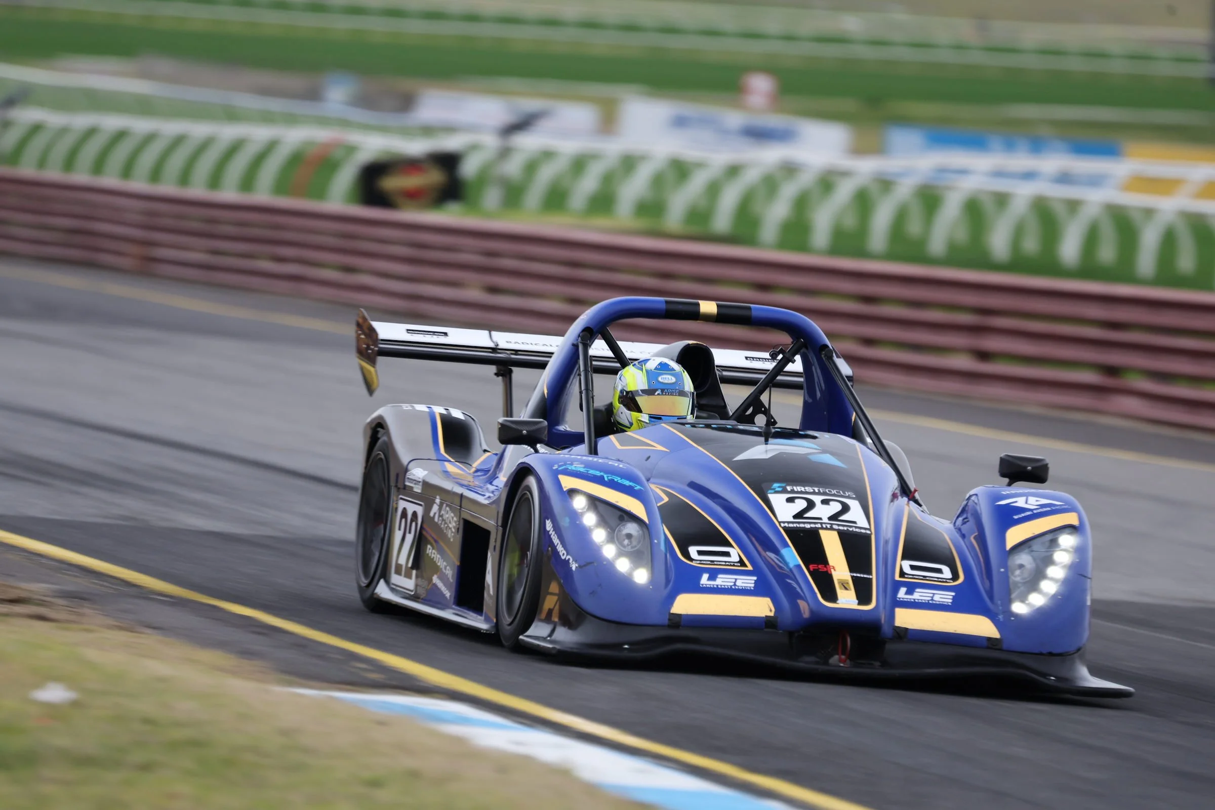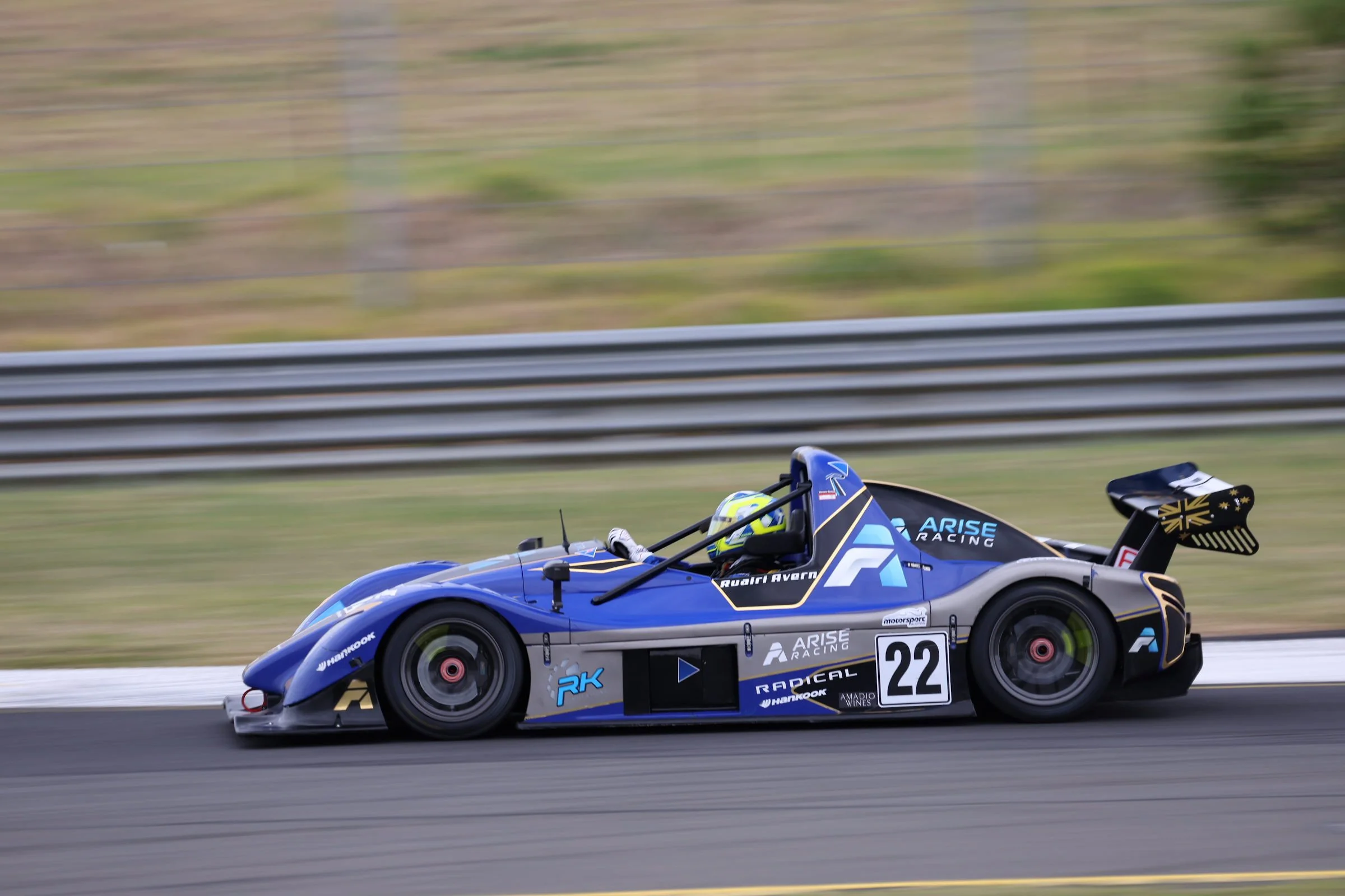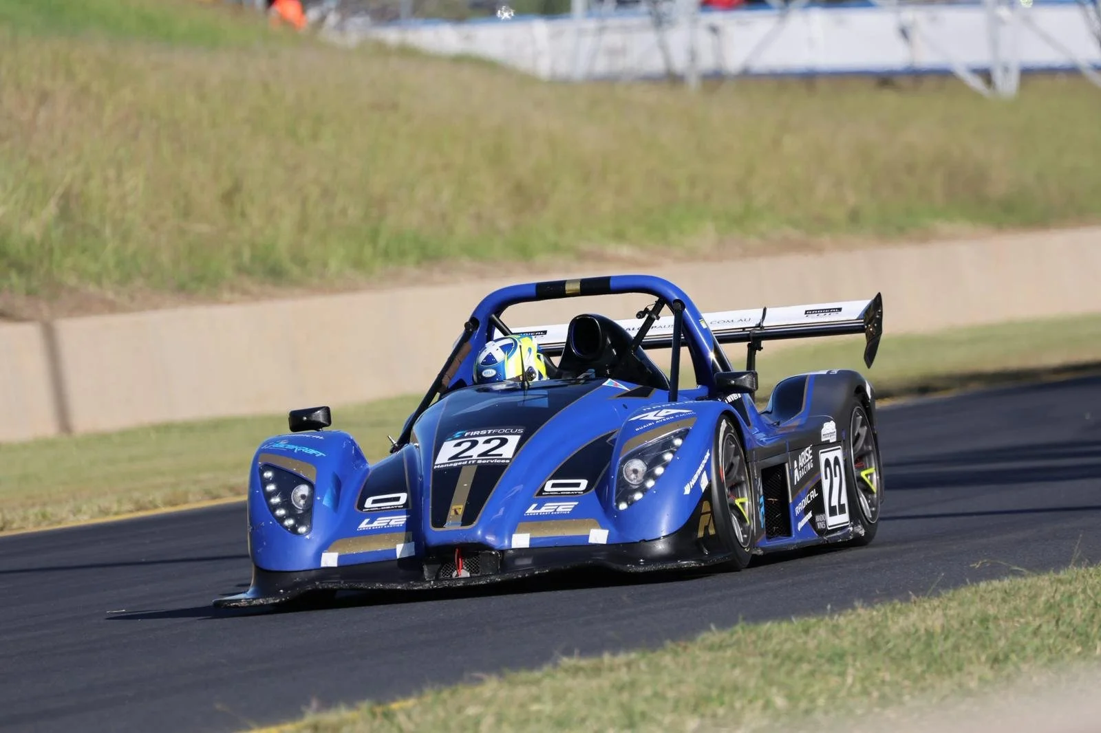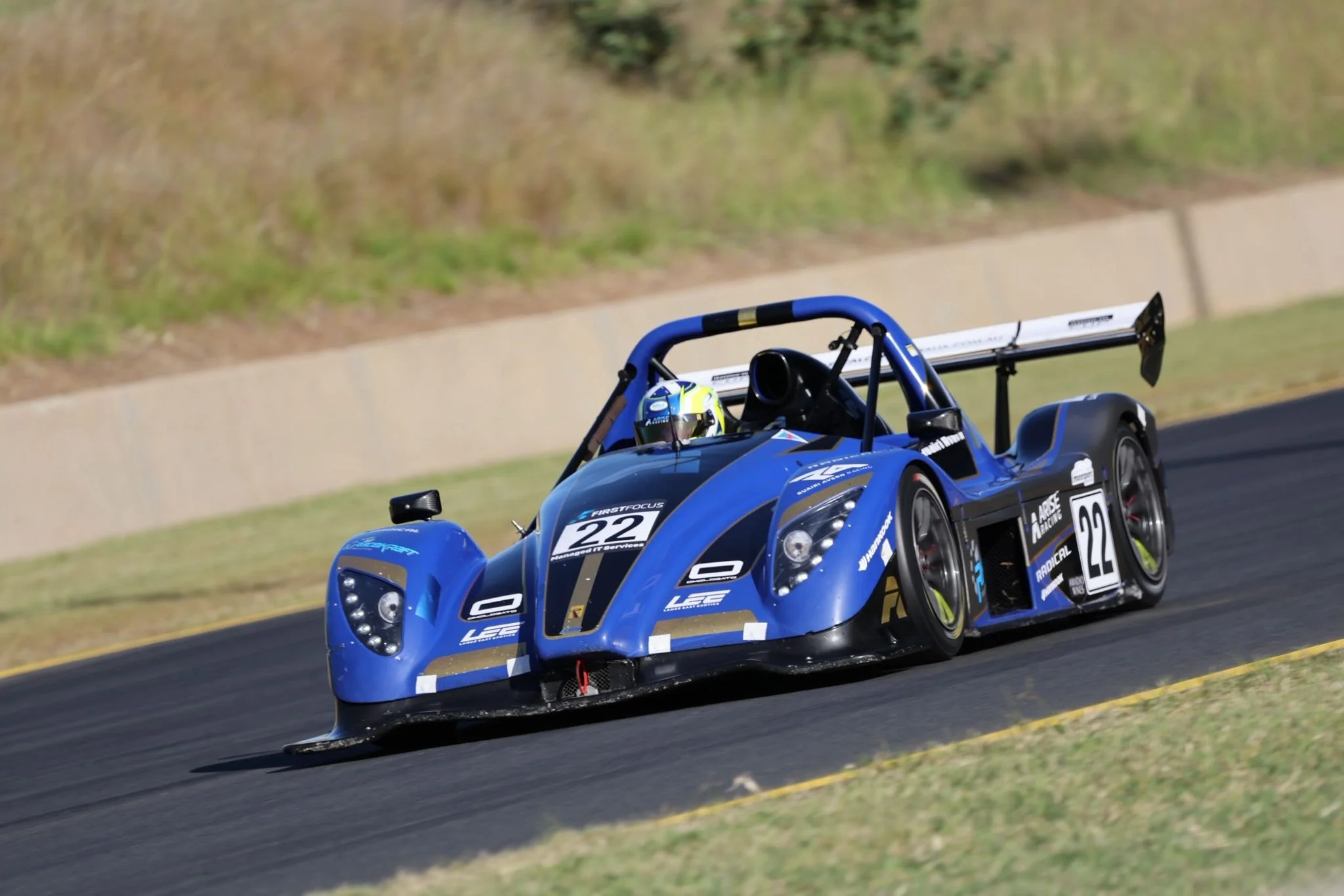 Blue race car with the number 22 on the front and side, racing on a track with grass and a concrete barrier in background. Sydney Motorsport Park. #SMP #RadicalCupAustralia #ruairiavern