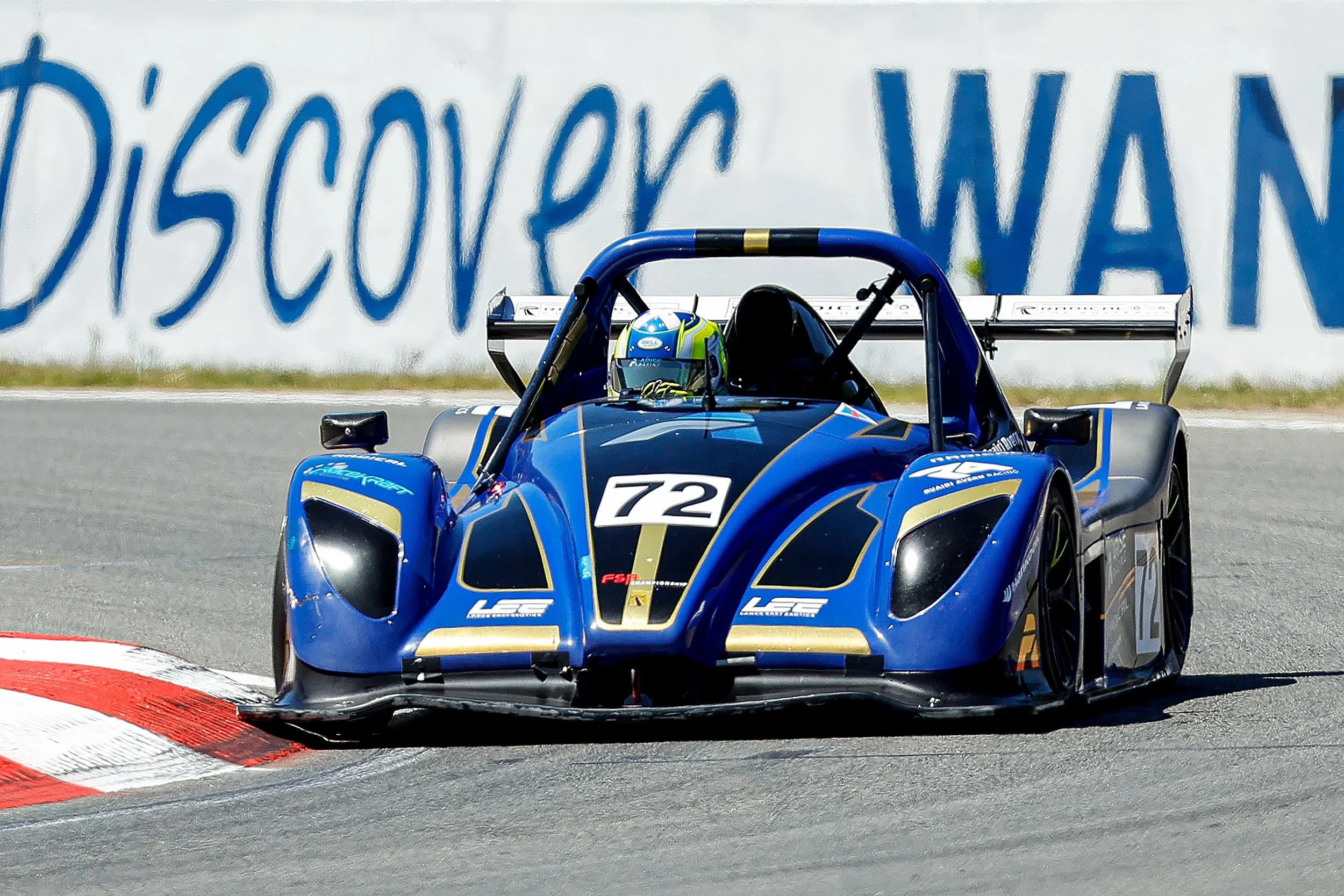 A blue Radical race car with the number 72 on the hood corners, driven by a helmeted driver, navigating a curve on a race track with a sign in the background that reads 'DISCOVER WANNEROO'. #FSR #ruairiavern #arise