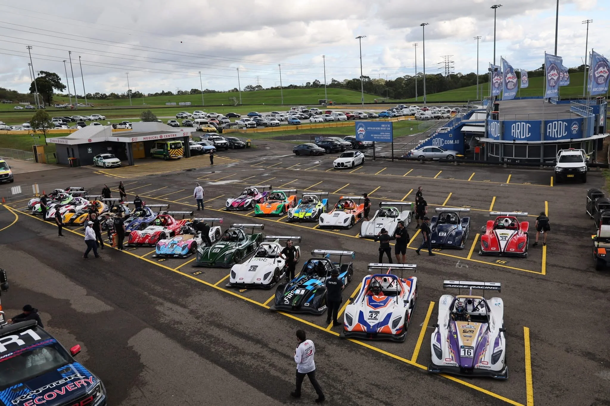 Radical race cars lined up at a Sydney Motorsport Park racetrack with a group of spectators around them, and grandstands in the background.  #SpeedSeries #SMP #RadicalCupAustralia #ruairiavern